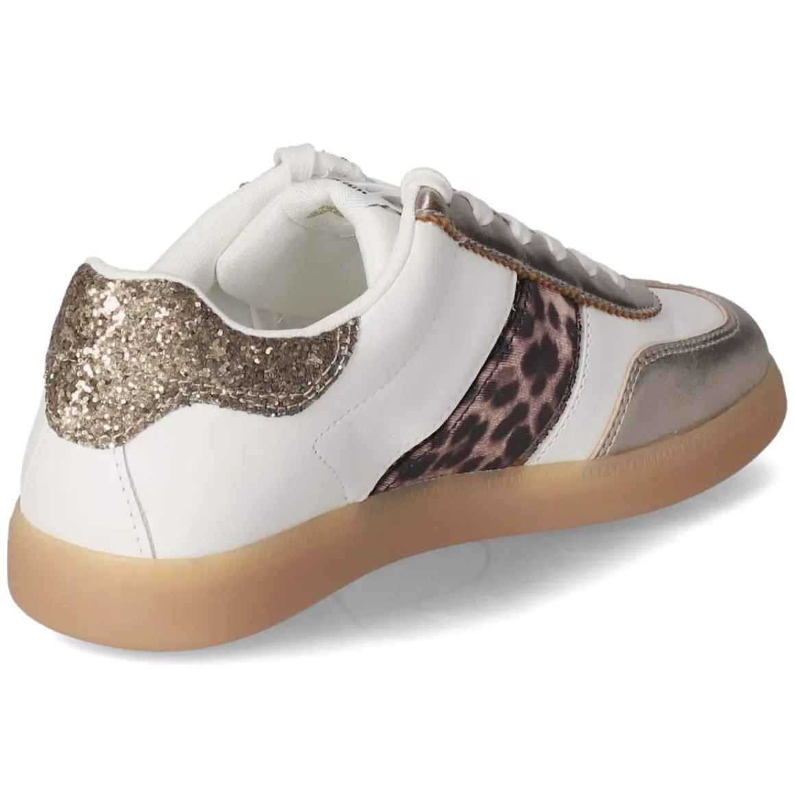 Der Low Sneaker von Tamaris verbindet cleanes Weiß mit subtilen Highlights und schafft so einen frischen Daily-Style. Das Obermaterial aus Synthetik, Leder und Textil setzt moderne Overlays in Szene, Teile im Animaldesign und goldfarbene Akzente sorgen für einen modischen Twist, während die Ferse mit Glitzer einen funkelnden Abschluss bildet. Runde Schuhspitze, normaler Fit und die Schnürung erlauben eine individuelle Anpassung. Ein gepolsterter Einstieg und das herausnehmbare, weich gepolsterte Wechselfußbett mit Textildecksohle bieten Komfort von früh bis spät. Stabilität liefern verstärkter Zehen- und Fersenbereich, die flexible, rutschhemmende Laufsohle sorgt für sicheren Tritt. Markendetails runden den Look ab. Modetipp: Besonders modern wirkt der Sneaker zu Cropped-Mom-Jeans, cremefarbenem Blazer und filigranen Gold-Accessoires; Socken in Offwhite schließen den Look harmonisch ab.