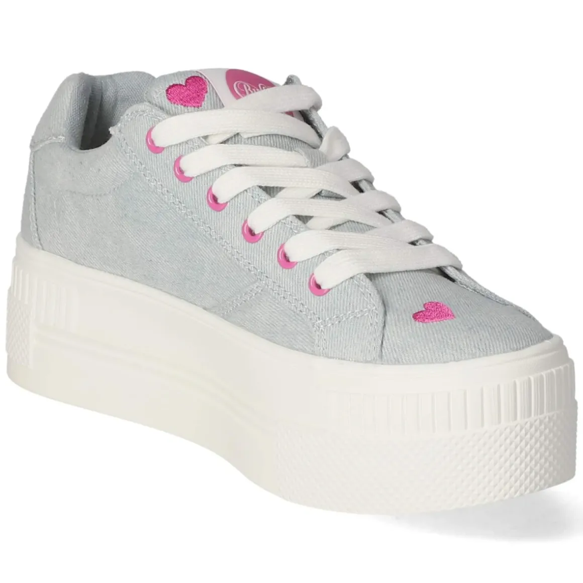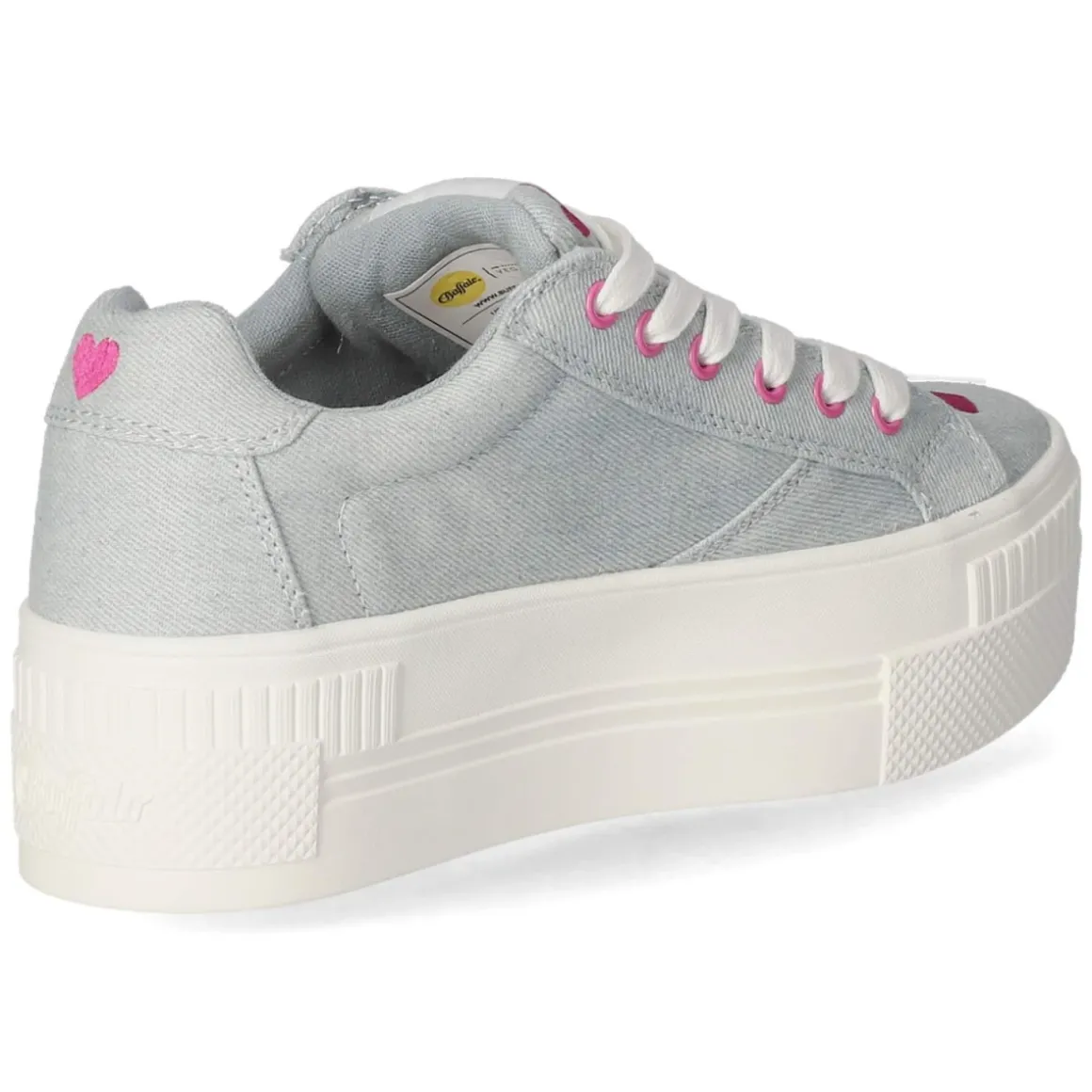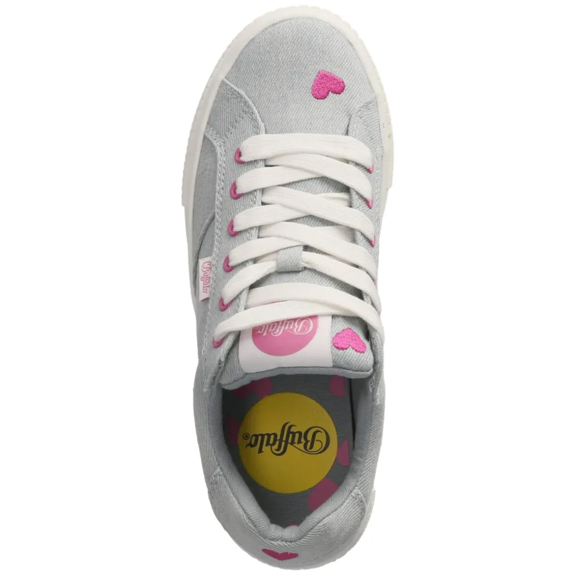 Der Low Sneaker PAIRED HEART von Buffalo setzt ein verspieltes Statement in Blau und bringt Komfort auf ein neues Level. Das leichte Textilobermaterial umschmeichelt den Fuß, während die runde Spitze und der bequem gepolsterte Einstieg den ganzen Tag über angenehmes Tragegefühl sichern. Eine markante Plateausohle mit 5 cm Höhe streckt die Silhouette, die verstärkte Ferse sorgt für Stabilität. Pinkfarbene Akzente, Herzchen und präzise Ziernähte unterstreichen den charakteristischen Look, Markendetails runden das Design ab. Dank Schnürsenkeln lässt sich die Passform individuell regulieren; das gepolsterte Wechselfußbett bietet bei Bedarf schnellen Austausch. Der Schuh fällt normal aus und eignet sich ideal für Damen, die einen frischen City-Stil bevorzugen. Modetipp: Besonders stimmig zu hellen Mom-Jeans, Cropped-Strick und einem leichten Trench in Naturtönen.