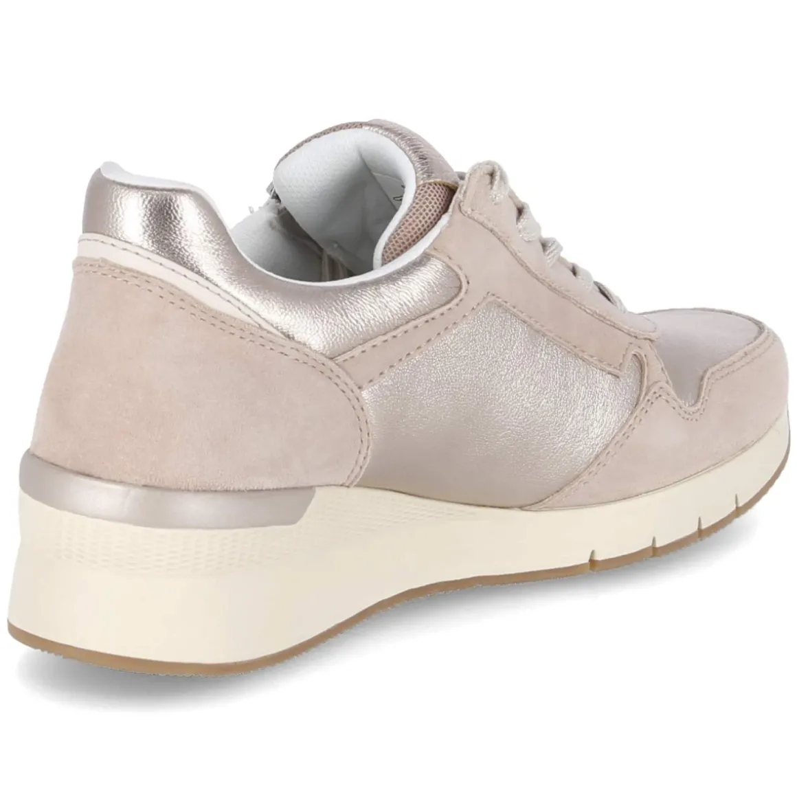 Der Low Sneaker von Gabor verbindet sportliche Leichtigkeit mit hochwertiger Verarbeitung. Das langlebige Echtleder in sanftem Beige wird durch metallisch glänzende Elemente elegant akzentuiert, während die runde Schuhspitze und der gepolsterte Einstieg für ein angenehmes Tragegefühl stehen. Schnürsenkel in Kombination mit zusätzlichem Reißverschluss erleichtern das An- und Ausziehen und sichern den Halt. Das gepolsterte, herausnehmbare Wechselfußbett auf einer Decksohle aus Textil bietet Komfort im Alltag und lässt sich bei Bedarf austauschen. Eine flexible, rutschhemmende Laufsohle mit leichtem Keil unterstützt ein entspanntes Abrollen; verstärkter Zehen- und Fersenbereich erhöht die Formstabilität. Fällt größengetreu aus. Modetipp: Mit cropped Jeans und Feinstrick in Naturtönen tragen, dazu goldene Accessoires, die die Metallic-Details des Sneakers aufgreifen.