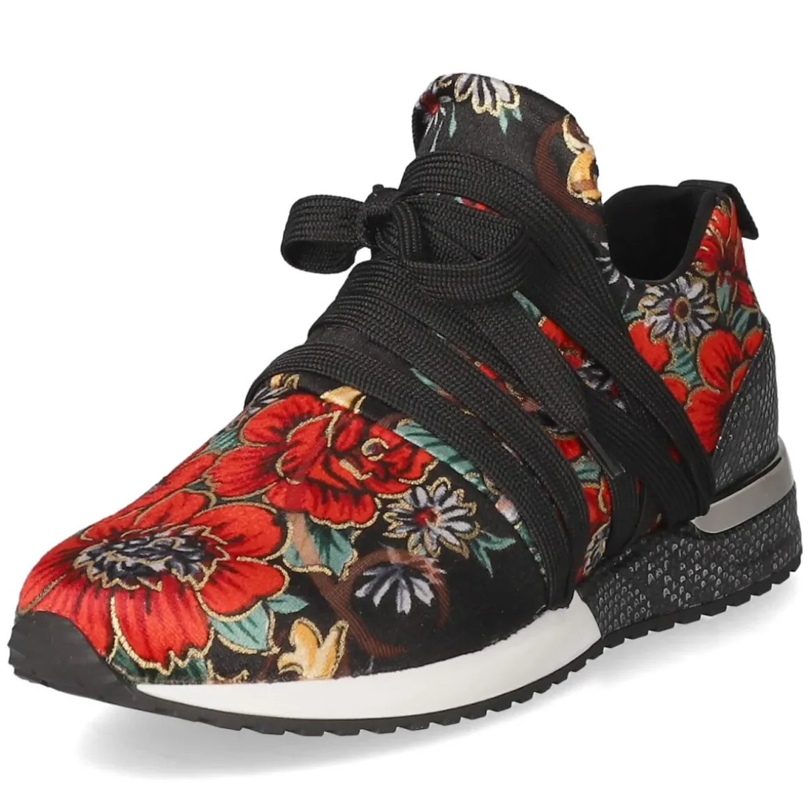 Der Low Sneaker von La Strada vereint feminine Raffinesse mit sportlicher Lässigkeit. Das tiefschwarze Grunddesign erhält durch das auffällige florale Muster einen edlen Twist, während die Ferse im Reptildesign und die Zierschnürung einen modischen Akzent setzen. Der leichte Textil-Synthetik-Mix schmiegt sich angenehm an, die runde Schuhspitze sorgt für entspanntes Abrollen. Dank Anziehlasche gelingt der schlupffreundliche Einstieg ohne Verschluss im Handumdrehen. Das komfortable Wechselfußbett mit textiler Decksohle unterstützt bei längeren Wegen, die flexible, rutschfeste Laufsohle bietet sicheren Halt – ideal auch für besondere Anlässe. Musterverläufe können variieren und machen jedes Paar einzigartig. Fällt normal aus. Modetipp: Mit Midirock aus Satin und kurzem Blazer entsteht ein spannender Look zwischen Romantik und Moderne.
