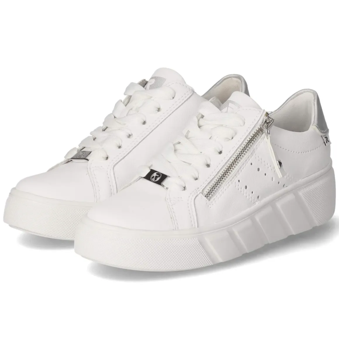 Der weiße Low Sneaker von Rieker verbindet sportliche Leichtigkeit mit durchdachtem Komfort. Glattes, atmungsaktives Echtleder formt das klare Obermaterial, silberfarbene Akzente setzen dezente Highlights. Die runde Schuhspitze sorgt für eine angenehme Zehenfreiheit, während eine verstärkte Ferse Stabilität gibt. Schnürsenkel und ein seitlicher Reißverschluss erleichtern das An- und Ausziehen und erlauben eine passgenaue Regulierung. Innen überzeugt eine textile Decksohle über einem weich gepolsterten Wechselfußbett, das bei Bedarf unkompliziert gegen eigene Einlagen getauscht werden kann. Der leicht gepolsterte Einstieg schont den Knöchel, die flexible, rutschhemmende Laufsohle bietet verlässlichen Grip im Alltag. Der Sneaker fällt normal aus und eignet sich ideal für Erwachsene, die Komfort und Zurückhaltung schätzen. Modetipp: Zu Cropped-Jeans und hellen Strickteilen entsteht ein cleanes City-Outfit.