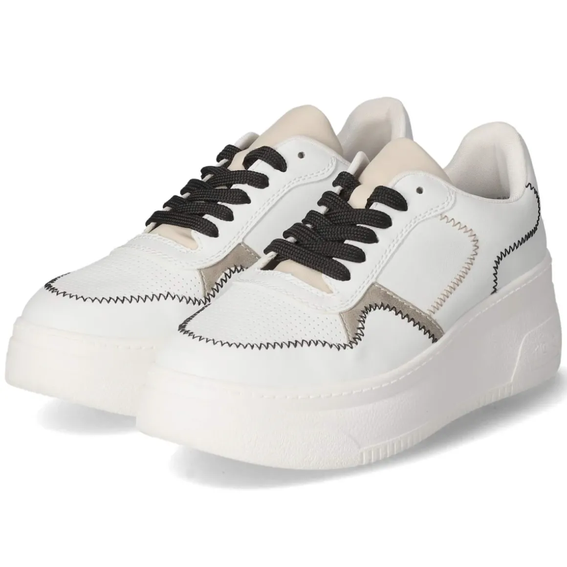 Der weiße Low Sneaker von Rieker verbindet sportliche Leichtigkeit mit urbanem Chic. Pflegeleichte Synthetik formt das klare Design, das durch perforiertes Schuhdeck, feine Ziernähte und dezente glänzende Akzente aufgewertet wird. Die runde Spitze und der verstärkte Zehen- und Fersenbereich sorgen für Alltagstauglichkeit, während der bequem gepolsterte Einstieg und das weich gepolsterte, herausnehmbare Wechselfußbett Komfort über den ganzen Tag bieten. Eine textile Decksohle schmeichelt dem Fuß, die rutschhemmende Laufsohle gibt verlässlichen Grip. Der 6 cm hohe Plateau-Absatz bringt unaufdringliche Höhe und streckt die Silhouette, ohne an Bequemlichkeit einzubüßen. Mit Schnürsenkeln individuell regulierbar und größengetreu in der Passform, gelingt ein sicherer Sitz für Damen. Modetipp: Zu Cropped-Jeans und einem cleanen Oversize-Shirt entfaltet der Sneaker seine minimalistische Wirkung, ein helles Crossbody-Bag setzt den finalen Akzent.