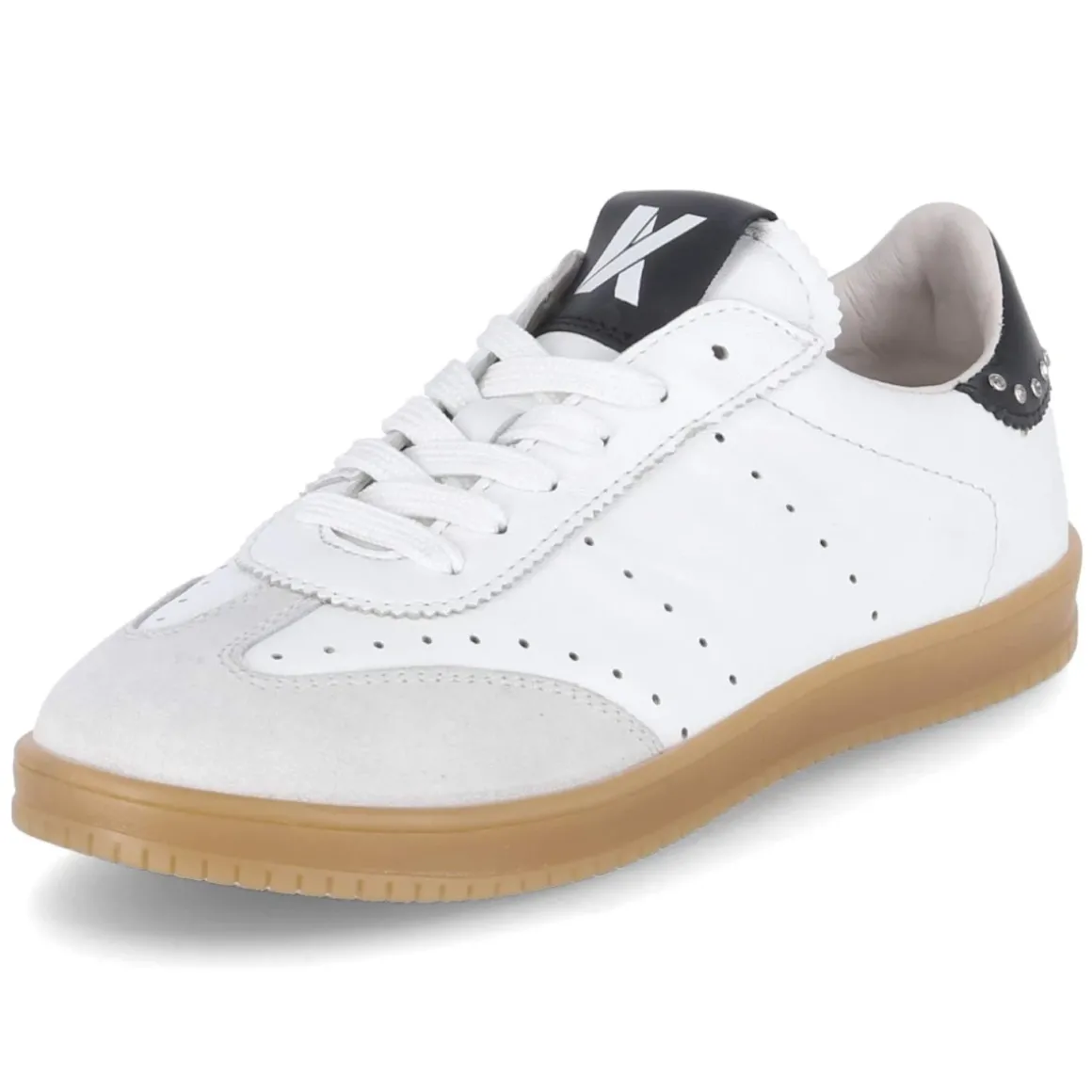 Der Low Sneaker von Kaerlek verbindet puristische Linien mit durchdachtem Komfort. Weißes Glattleder, runde Spitze und klassische Schnürung schaffen einen zeitlosen Look, der dank zierender Seitenlochung und schwarzer Fersenklappe mit glitzerndem Schmucksteinbesatz subtil veredelt wird. Lederfutter und eine gepolsterte, mit Leder bezogene Wechselfußbett-Einlage sorgen für ein angenehm trockenes Fußklima und individuellen Halt. Der Einstieg ist leicht gepolstert, Zehen- und Fersenbereich sind verstärkt, die flexible, rutschhemmende Laufsohle begleitet sicher durch den Tag. Das Modell fällt normal aus und punktet mit langlebigem Echtleder und vielfältigen Kombinationsmöglichkeiten. Modetipp: Für einen modernen Kontrast den Clean-Look mit verkürzter Straight-Jeans und schwarzem Oversize-Blazer aufgreifen, dabei die Fersenklappe farblich in Accessoires zitieren.