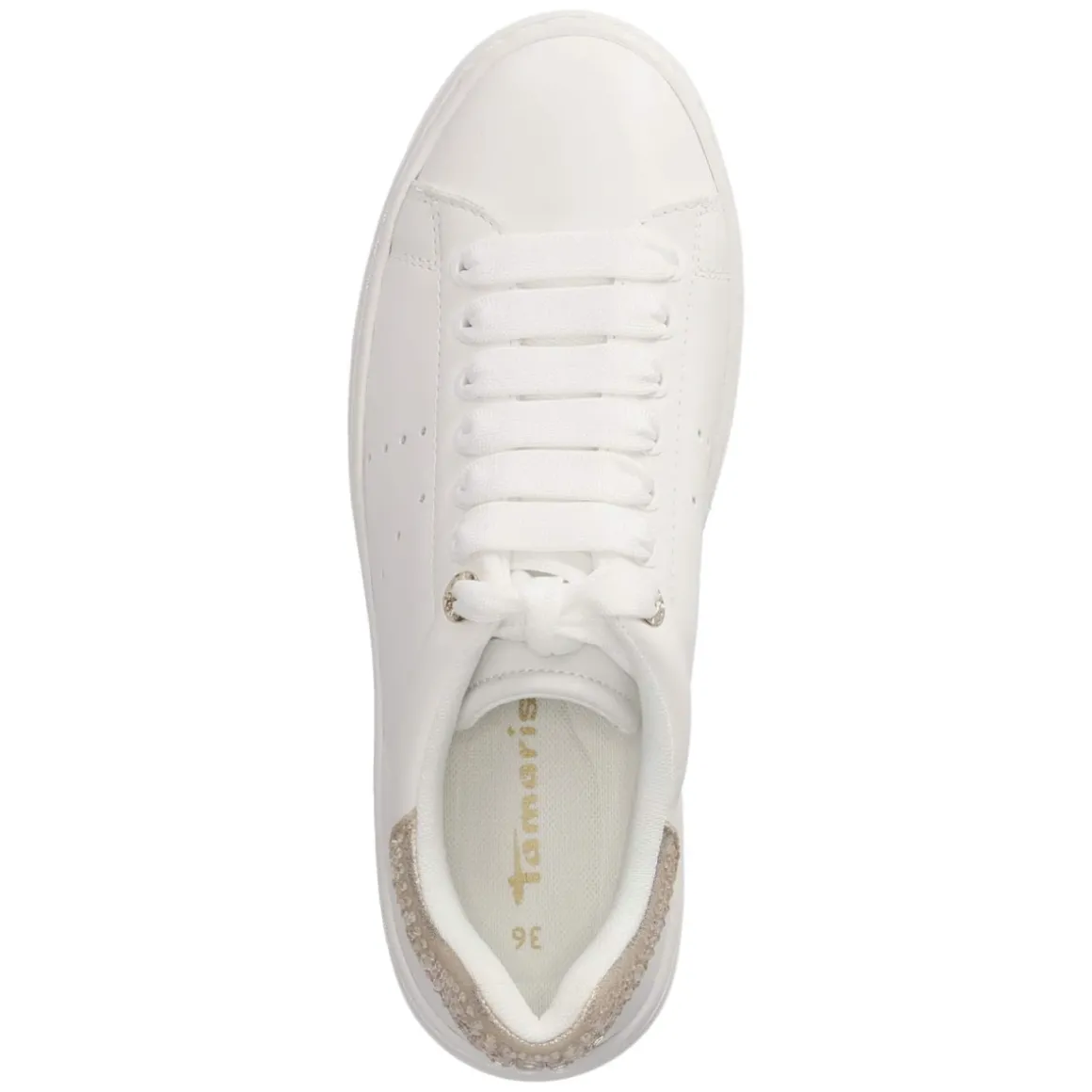 Dieser Low Sneaker von Tamaris kombiniert sportliche Lässigkeit mit einem Hauch Glam. Das weiße Obermaterial aus Synthetik, Leder und Textil zeigt eine glitzernde Oberfläche, während perforierte Partien für leichte Frische sorgen. Die verstärkte Ferse in Beige mit funkelnden Schmucksteinen setzt einen eleganten Akzent und gibt zusätzlichen Halt. Schnürsenkel erlauben eine individuelle Anpassung, die runde Schuhspitze und das geringe Gewicht steigern den Komfort im Alltag. Ein weich gepolsterter Einstieg und das gepolsterte, herausnehmbare Fußbett begleiten durch lange Tage, die 3,5 cm hohe Plateau-Sohle verleiht eine dezente Höhe. Fällt normal aus und passt mühelos zu unterschiedlichsten Looks. Modetipp: Mit Cropped-Jeans, weißem Oversize-Hemd und goldfarbenen Accessoires entsteht ein moderner City-Chic mit subtiler Strahlkraft.
