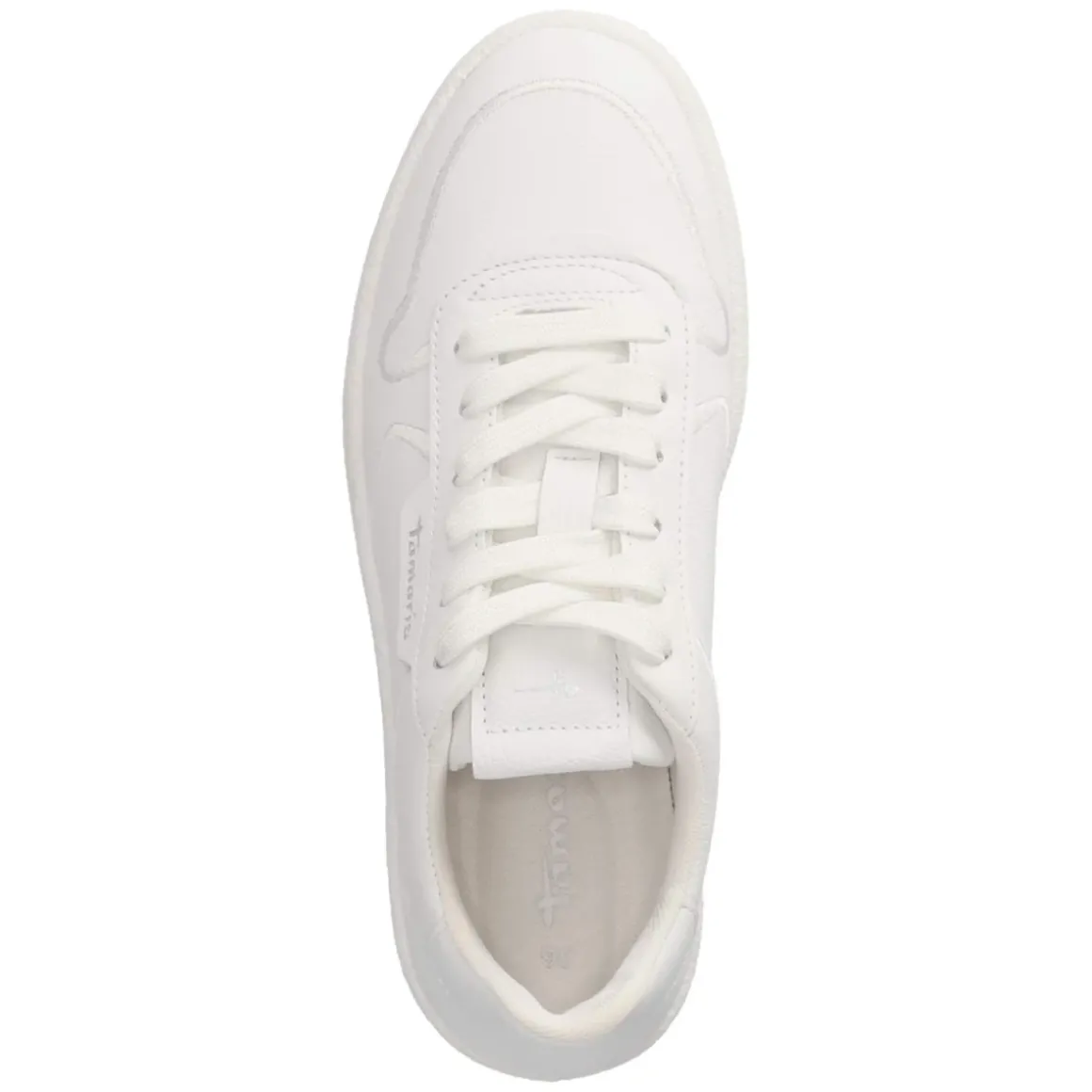 Der Low Sneaker von Tamaris verbindet schlichte Eleganz mit verlässlichem Komfort. Das weiße Obermaterial aus robustem, glattem Echtleder setzt auf klare Linien und ein gepflegtes Erscheinungsbild, während gestickte Zierstreifen und ein dezenter Markenschriftzug subtilen Charakter verleihen. Die runde Spitze und die klassische Schnürung ermöglichen eine angenehme, eigene Anpassung. Innen sorgt eine Textildecksohle zusammen mit dem gepolsterten, herausnehmbaren Wechselfußbett für sanfte Dämpfung im Alltag. Eine flexible, griffige Laufsohle bietet Halt auf urbanem Terrain, die verstärkte Ferse schenkt zusätzliche Stabilität. Der Schnitt fällt normal aus und ergänzt vielfältige Outfits von smart bis casual. Modetipp: Für einen frischen City-Look mit cropped Straight-Jeans, weißem T-Shirt und Trench oder, sportlich interpretiert, mit geripptem Stricksocke und Midirock kombinieren.