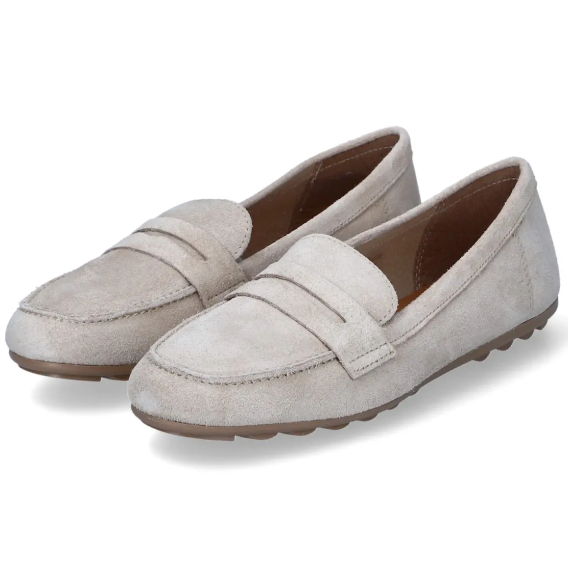 Beige Mokassins von Tamaris, gefertigt aus langlebigem Echtleder in feinem Rauleder-Finish, verbinden zeitlose Klasse mit modernem Anspruch. Die samtige Oberfläche, der klassische Mokassin-Stich und der elegante Zierriemen sorgen für eine gepflegte Optik, während die runde Schuhspitze und der bequeme Schlupfeinstieg jeden Tag unkompliziert machen. Ein gepolstertes Fußbett trifft auf eine gepolsterte Lederdecksohle und liefert sanfte Dämpfung, die verstärkte Ferse erhöht die Formstabilität. Die flexible, rutschhemmende Laufsohle begleitet sicher durch Büro und Stadt. Hinweis zur Passform: fällt kleiner aus. Modetipp: mit Cropped-Jeans und Trenchcoat kommt die beige Nuance besonders modern zur Geltung; zarte Schmuckakzente und eine strukturierte Ledertasche runden den Look ab.