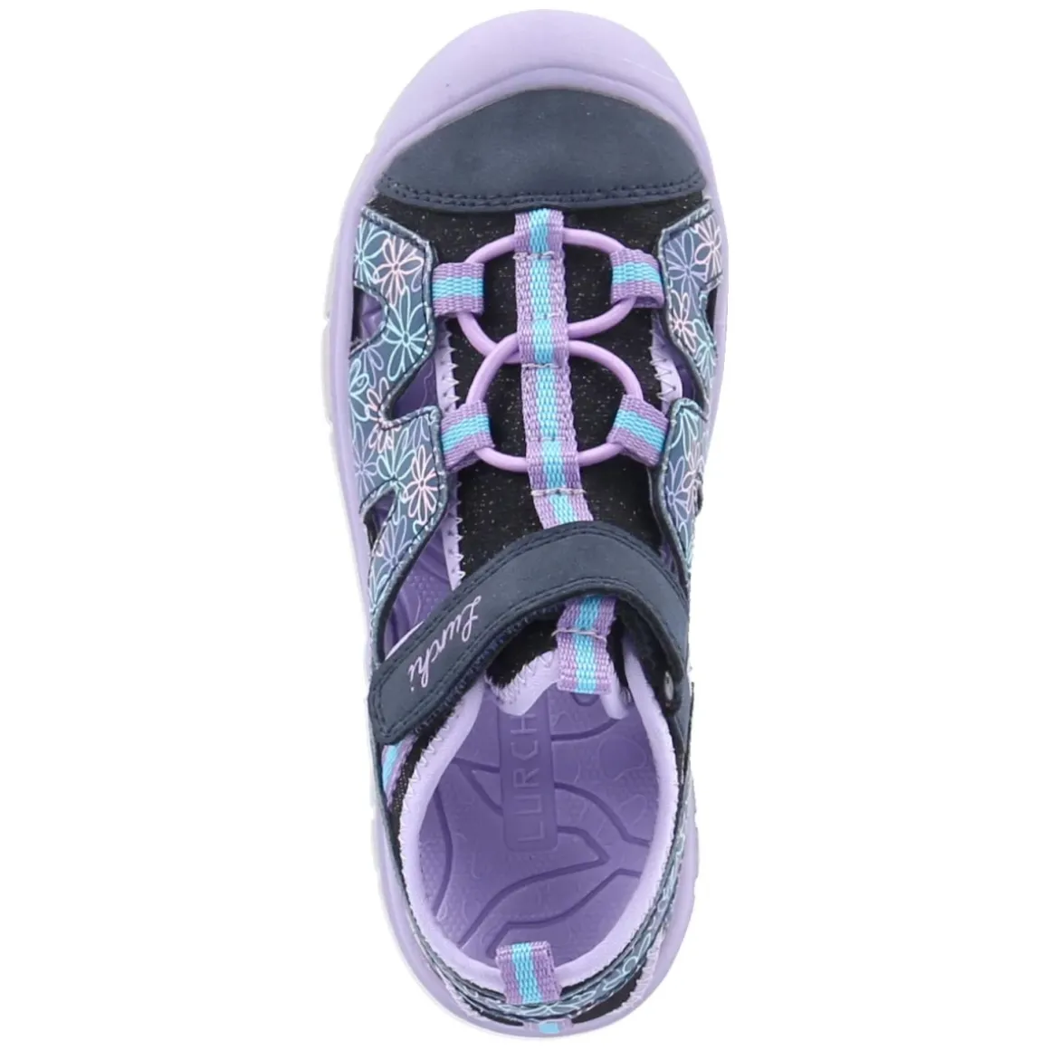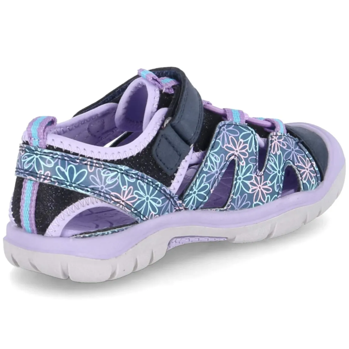 Die Lurchi Outdoorsandalen kombinieren kindgerechtes Design mit funktionalen Details für aktive Tage. Der moderne Material-Mix aus Textil und Synthetik zeigt sich in frischem Lila mit bedruckten Akzenten und einem seitlichen Blumenprint. Der runde, geschlossene Zehenbereich mit Schutzkappe bewahrt empfindliche Zehen beim Klettern und Toben. Ein weiches, herausnehmbares Synthetikfußbett bietet angenehmen Komfort und ermöglicht bei Bedarf den Einsatz eigener Einlagen. Dank bequemem Klettverschluss und zusätzlichem Elastikband in Schnüroptik gelingt das An- und Ausziehen schnell und sicher. Die flexible, rutschhemmende Profillaufsohle sorgt für verlässlichen Grip auf unterschiedlichen Untergründen, während der Schnitt normal ausfällt. Modetipp: Zu Shorts in Naturtönen und einem T-Shirt mit Blumenmotiv entsteht ein fröhlicher Outdoor-Look, der die Prints der Sandale stilvoll aufgreift.