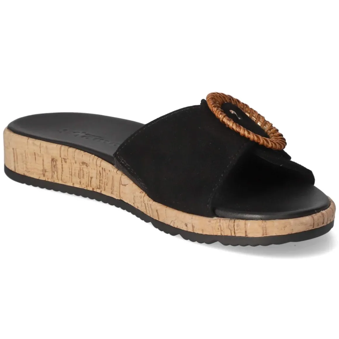 Tamaris Pantoletten in klassischem Schwarz verbinden luftige Eleganz mit komfortorientierten Details. Die offene Schuhspitze und das atmungsaktive Echtleder schaffen ein angenehmes Klima, während die weiche, gepolsterte Decksohle aus Leder jeden Schritt sanft abfedert. Obermaterial aus hochwertigem Rauleder sorgt für eine edle Haptik, der bequeme Klettverschluss mit kleinem Elastikeinsatz ermöglicht eine individuelle Weitenregulierung. Blickfang ist die Zierschnalle in Flechtoptik, die vom Sohlenrahmen in Korkoptik stilvoll ergänzt wird. Eine flexible Laufsohle unterstützt natürliche Abrollbewegungen und macht die Pantoletten zum verlässlichen Begleiter im Alltag. Der Größenhinweis fällt normal aus und erleichtert die Wahl. Modetipp: Besonders harmonisch wirken die Pantoletten zu fließenden Midikleidern, einer Leinen-Culotte oder zu monochromen Sommerlooks mit sanften Texturen.