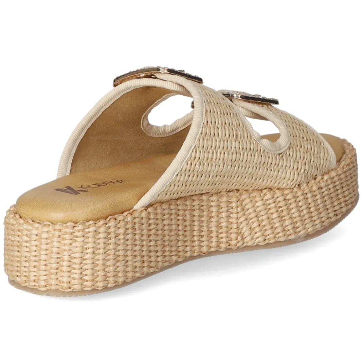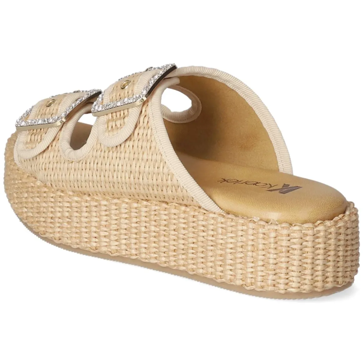 Die Pantoletten NATURALE von Kaerlek verbinden sommerliche Leichtigkeit mit modernem Design. Das beige Obermaterial aus hochwertig modern designter Synthetik zeigt eine feine Sisaloptik, die zusammen mit dem 4,5 cm hohen Plateau eine natürliche Textur und angenehme Höhe bringt. Die offene Schuhspitze unterstreicht den luftig-freien Charakter, während zwei goldfarbene Schnallen mit glitzernden Schmucksteinen einen eleganten Akzent setzen. Dank sicherer Schnallen lässt sich die Weite individuell anpassen, das gepolsterte Fußbett und die Decksohle aus Leder sorgen für dauerhaften Tragekomfort. Die Passform fällt normal aus und begleitet mühelos durch Alltag und Stadtbummel. Modetipp: zu fließenden Leinenkleidern oder Culottes und einer Basttasche kombinieren – die neutrale Beige-Nuance und die Sisaloptik harmonieren perfekt mit natürlichen Materialien.