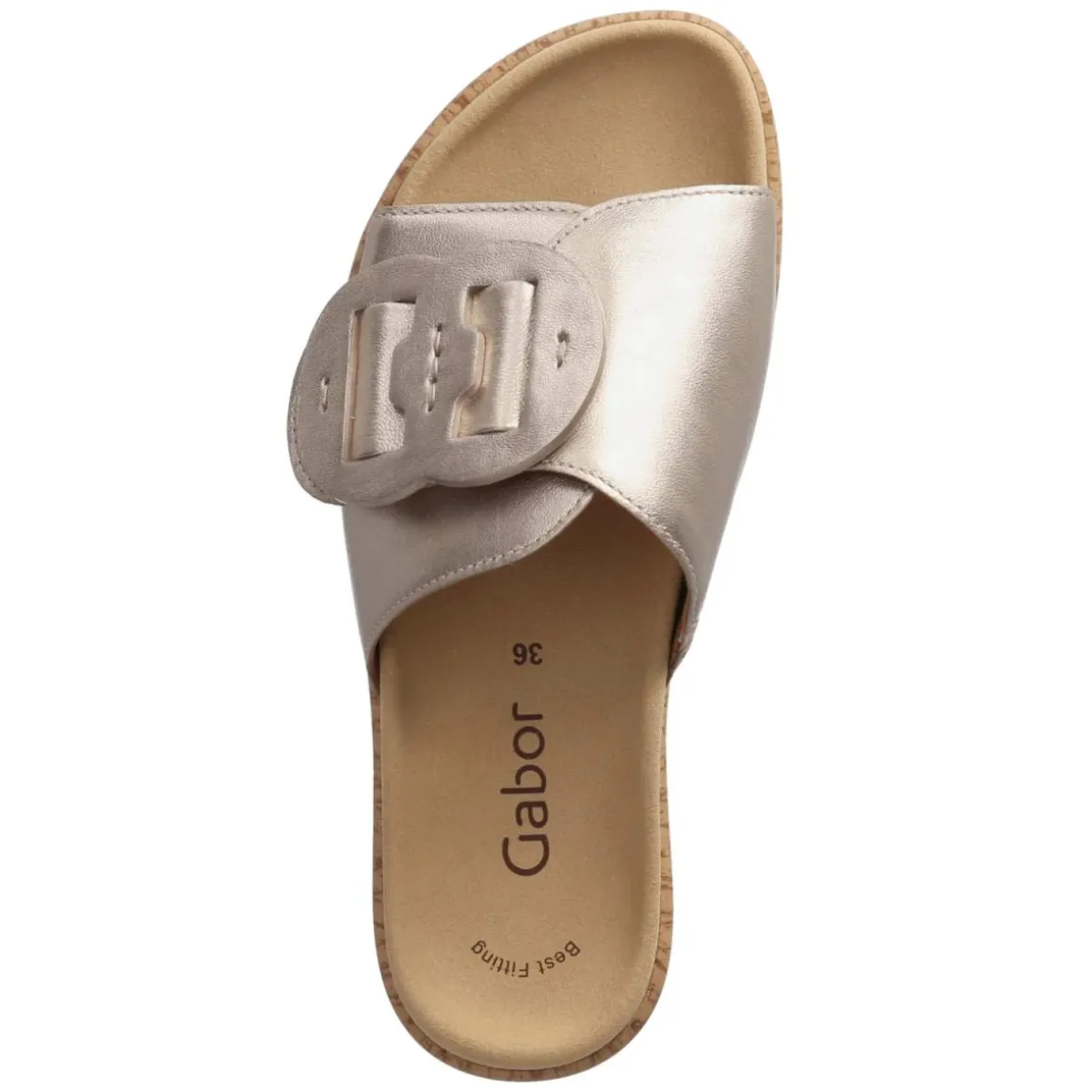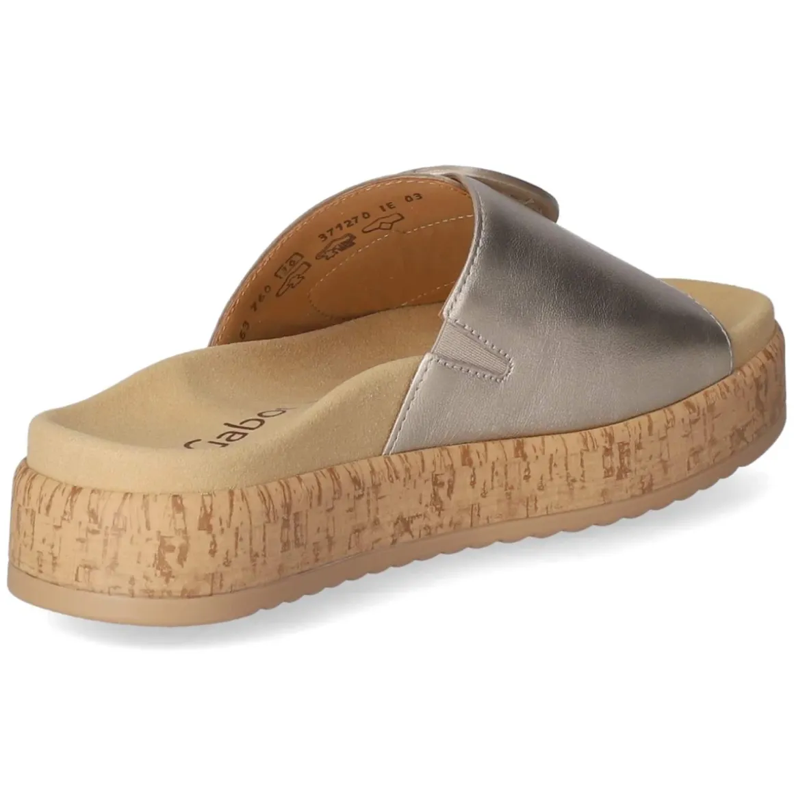 Goldfarbene Pantoletten von Gabor bringen subtilen Glanz in den Sommer. Das Obermaterial aus langlebigem Glattleder schmiegt sich weich an den Fuß, während die offene Schuhspitze luftige Leichtigkeit bietet. Die vorgeformte, gepolsterte Decksohle aus Textil unterstützt angenehm und ermöglicht langes Tragen. Ein bequemer Klettverschluss erlaubt individuelles Anpassen und macht das An- und Ausziehen unkompliziert. Sicherer Auftritt dank rutschfester Plateausohle mit Korkoptik; der 4 cm hohe Plateauabsatz streckt sanft, ohne an Bodenhaftung einzubüßen. Ein aufgenähtes Zierelement setzt einen eleganten Akzent, der die metallische Nuance harmonisch aufgreift. Fällt normal aus und eignet sich als verlässlicher Begleiter im Alltag wie zu Anlässen. Modetipp: Zur Culotte in Creme und einer Seidenbluse entsteht ein moderner City-Look; abends ergänzt zarter Goldschmuck die edle Ausstrahlung.