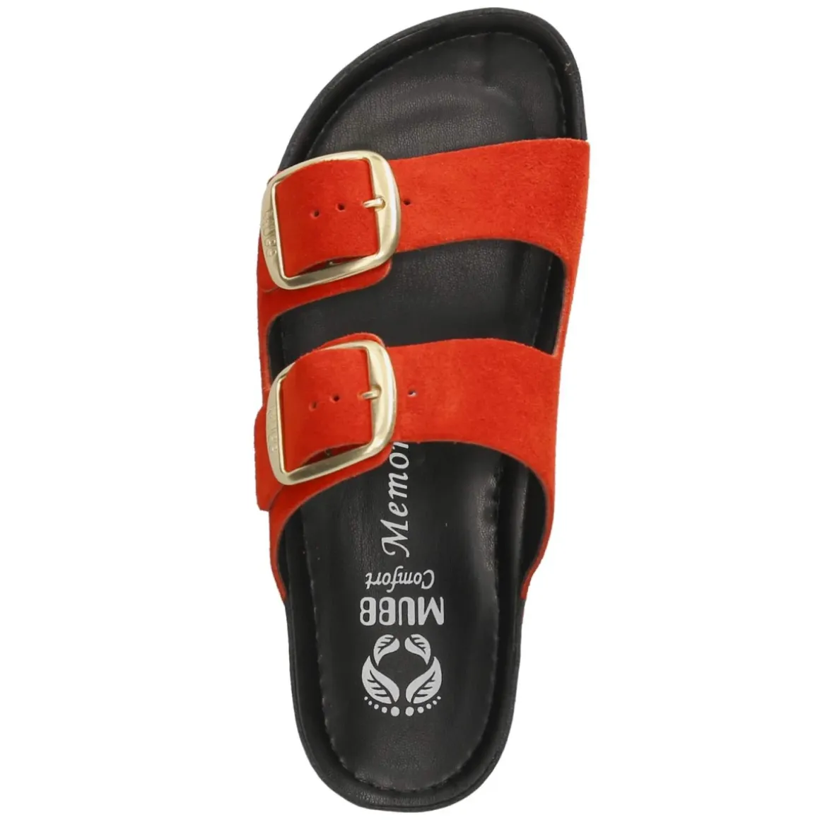 Mubb Pantoletten für Damen in leuchtendem Rot, aus robustem Echtleder mit weichem Rauleder-Finish. Die offene Schuhspitze und die flexible Laufsohle sorgen für luftiges Tragegefühl und geschmeidigen Abrollkomfort. Eine vorgeformte Decksohle aus Leder unterstützt den Fuß, während sichere Schnallen den Halt fein regulieren. Goldene Akzente setzen einen eleganten Kontrast und veredeln das klare Design. Der Verschluss über Schnallen ist langlebig und passt sich der normalen Passform zuverlässig an; das Modell fällt normal aus und eignet sich für Erwachsene, die Wert auf Qualität legen. Perfekt für lange Tage in der Stadt wie für den Wochenendbummel. Modetipp: Das intensive Rot harmoniert besonders mit cremefarbenen Leinenlooks oder Denim in Mittelblau, dazu eine goldene Gliederkette, um die Akzente aufzugreifen.