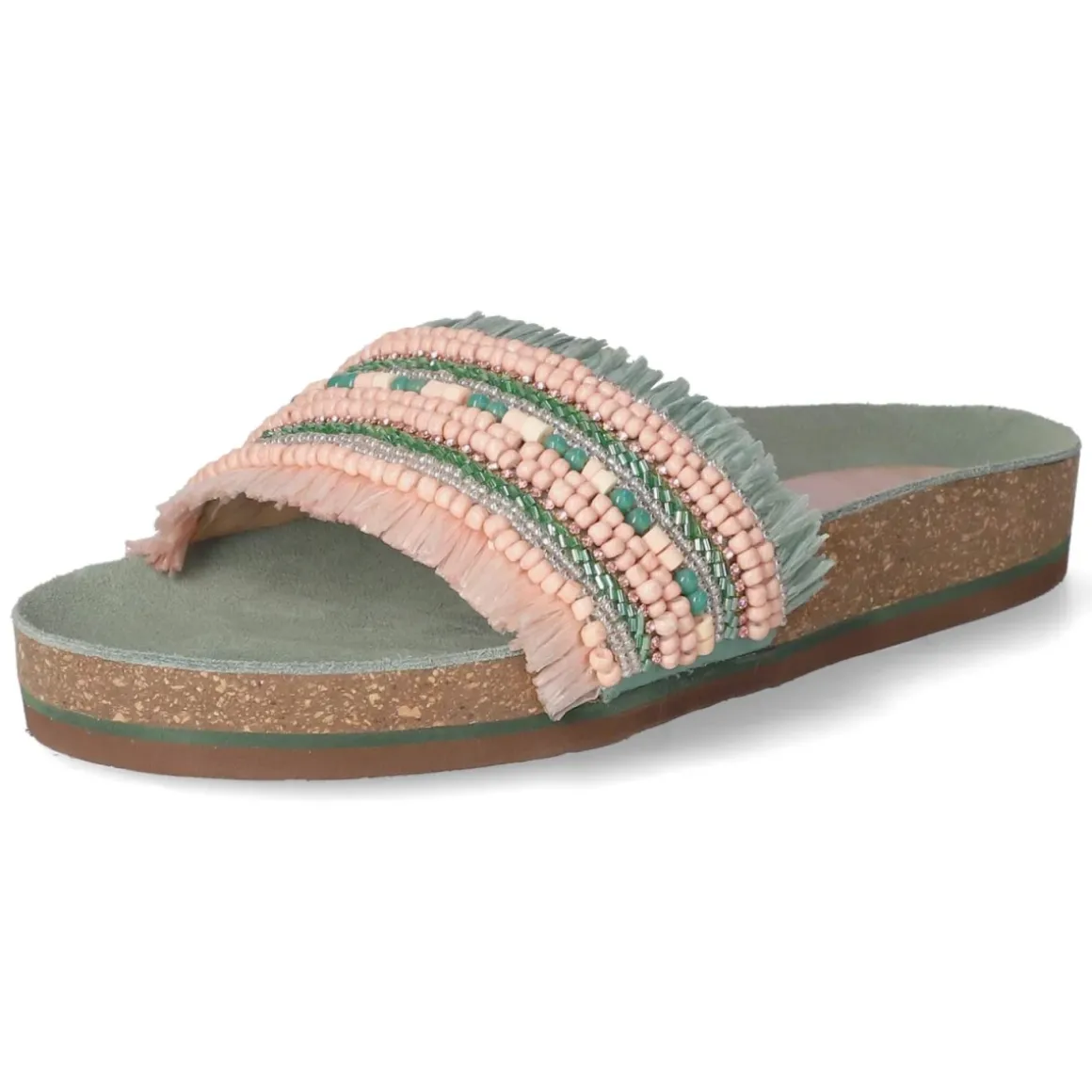 Sommerliches Statement in Grün: Die Pantoletten von LAZAMANI verbinden eine lässige Optik mit hochwertiger Verarbeitung. Das Obermaterial aus Textil zeigt grün-rosa Streifen, die durch unterschiedlich funkelnde Schmucksteine betont werden, während Fransendetails am Rand für eine entspannte Boho-Note sorgen. Eine echte Lederdecksohle und das weich gepolsterte Fußbett bieten angenehmen Komfort, die offene Schuhspitze lässt Luft an den Fuß. Dank ohne Verschluss gelingt das Hineinschlüpfen im Handumdrehen, die flexible, rutschhemmende Laufsohle sorgt für Halt auf verschiedensten Untergründen. Das Modell fällt normal aus und trägt sich vielseitig zu sommerlichen Looks. Modetipp: Für einen modernen Kontrast ein schlichtes Leinenkleid in Naturtönen kombinieren und dazu eine Basttasche wählen – so kommen Farben, Steine und Fransen besonders stilvoll zur Geltung.