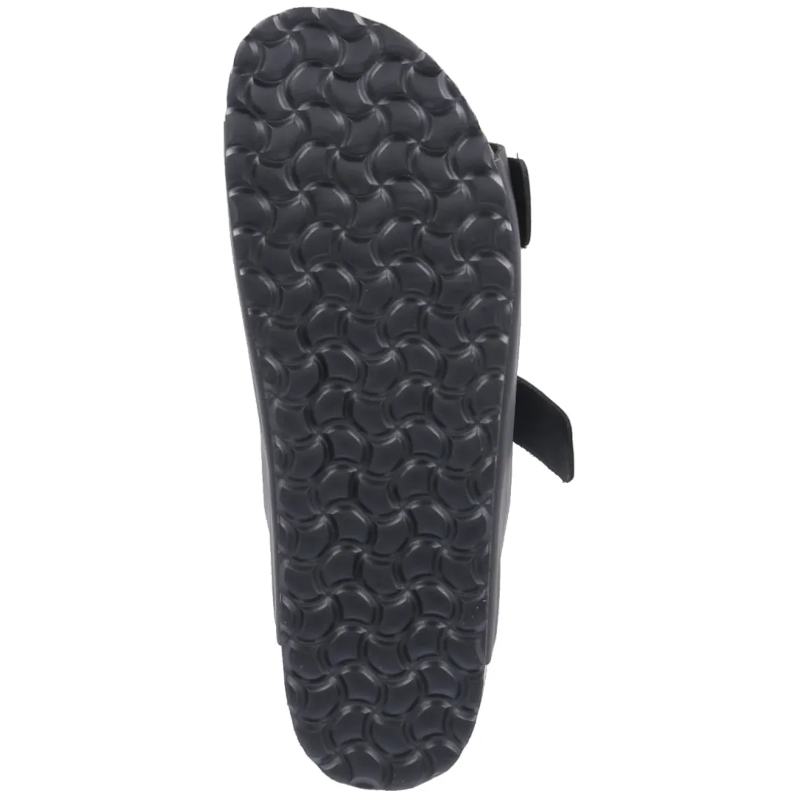Die Pantoletten von Empor verbinden einen kernigen, rustikalen Look mit ganztägigem Komfort. Schwarzes Glattleder umschließt zwei breite Riemen, die per praktischen Schnallen individuell angepasst werden. Die offene Schuhspitze und atmungsaktives Echtleder sorgen für ein angenehmes Fußklima, während das gepolsterte Tieffußbett mit Lederbezug die Sohle sanft unterstützt. Eine profilierte Laufsohle gibt sicheren Halt auf unterschiedlichen Untergründen. Die Passform fällt normal aus und bietet zuverlässige Stabilität im Alltag. Ob für den Weg ins Büro in der warmen Saison oder für entspannte Stunden auf der Terrasse, diese Herren-Pantoletten überzeugen durch Vielseitigkeit und Langlebigkeit. Modetipp: Zu gekrempelter Leinenhose und einem luftigen Overshirt entsteht ein lässig-urbaner Sommerlook.