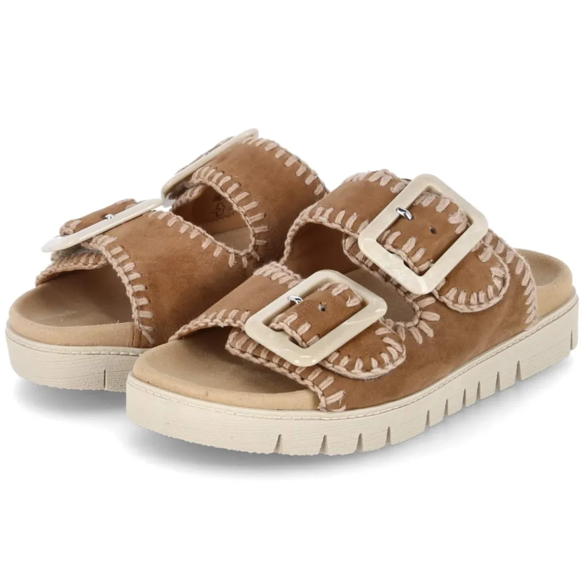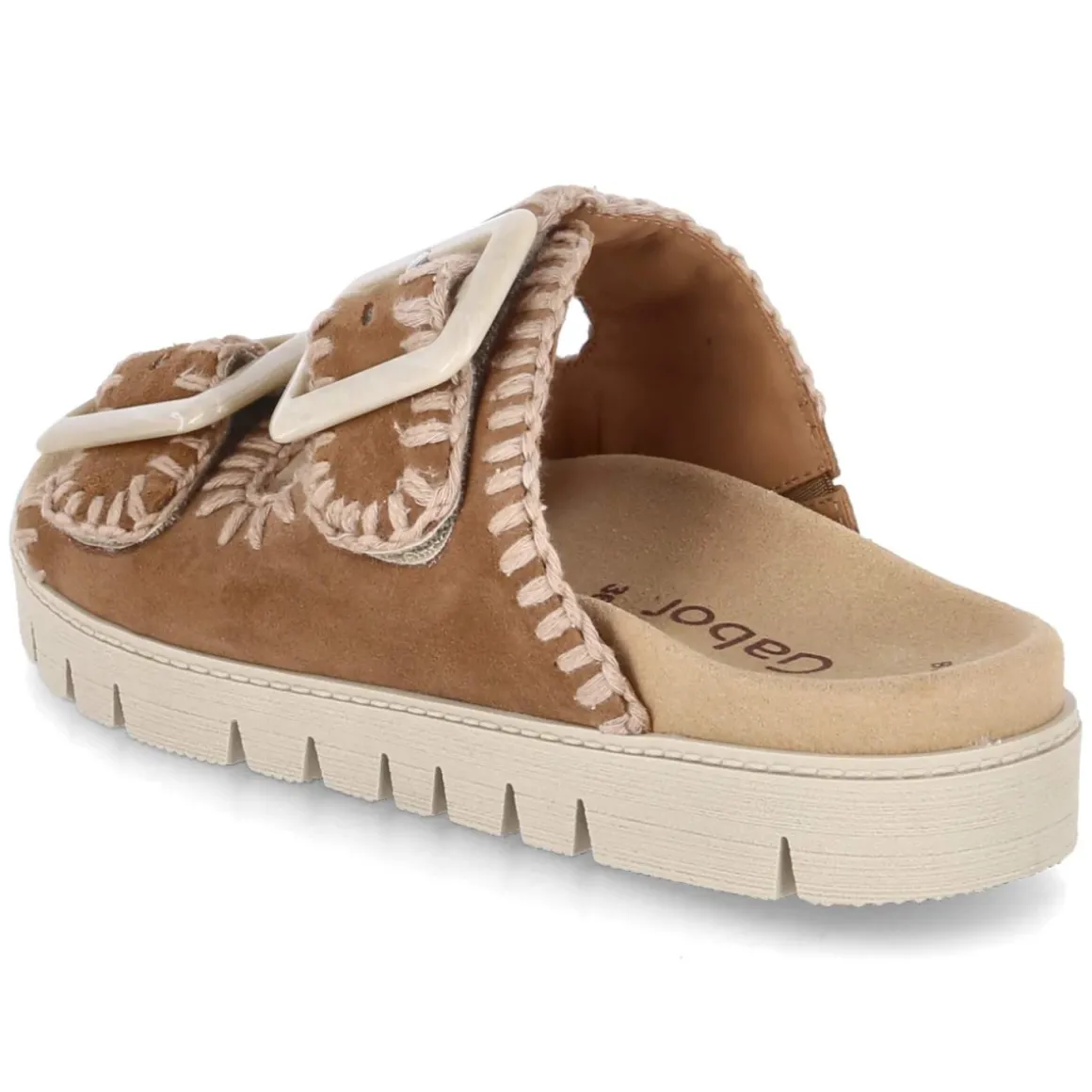 Diese Gabor Pantoletten vereinen lässige Natürlichkeit mit hohem Tragekomfort. Das braune Obermaterial aus langlebigem Rauleder verleiht einen warmen, authentischen Look, den markante, grobe Nähte und zwei verstellbare Klettriemen mit Zierschnallen stilsicher akzentuieren. Die offene Schuhspitze sorgt für Luftigkeit, während das vorgeformte, gepolsterte Tieffußbett mit textiler Decksohle die Füße angenehm umschließt. Eine flexible, rutschfeste Laufsohle bietet sicheren Halt im Alltag, vom Stadtbummel bis zur Gartenterrasse. Die Passform fällt normal aus und macht das Anziehen unkompliziert. Modetipp: Zu einem Midi-Jeansrock, einer leichten Leinenbluse und einer Basttasche entsteht ein entspannter Sommer-Look, der die natürliche Braunnuance besonders schön hervorhebt.