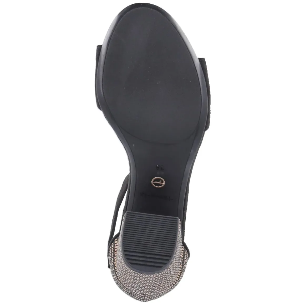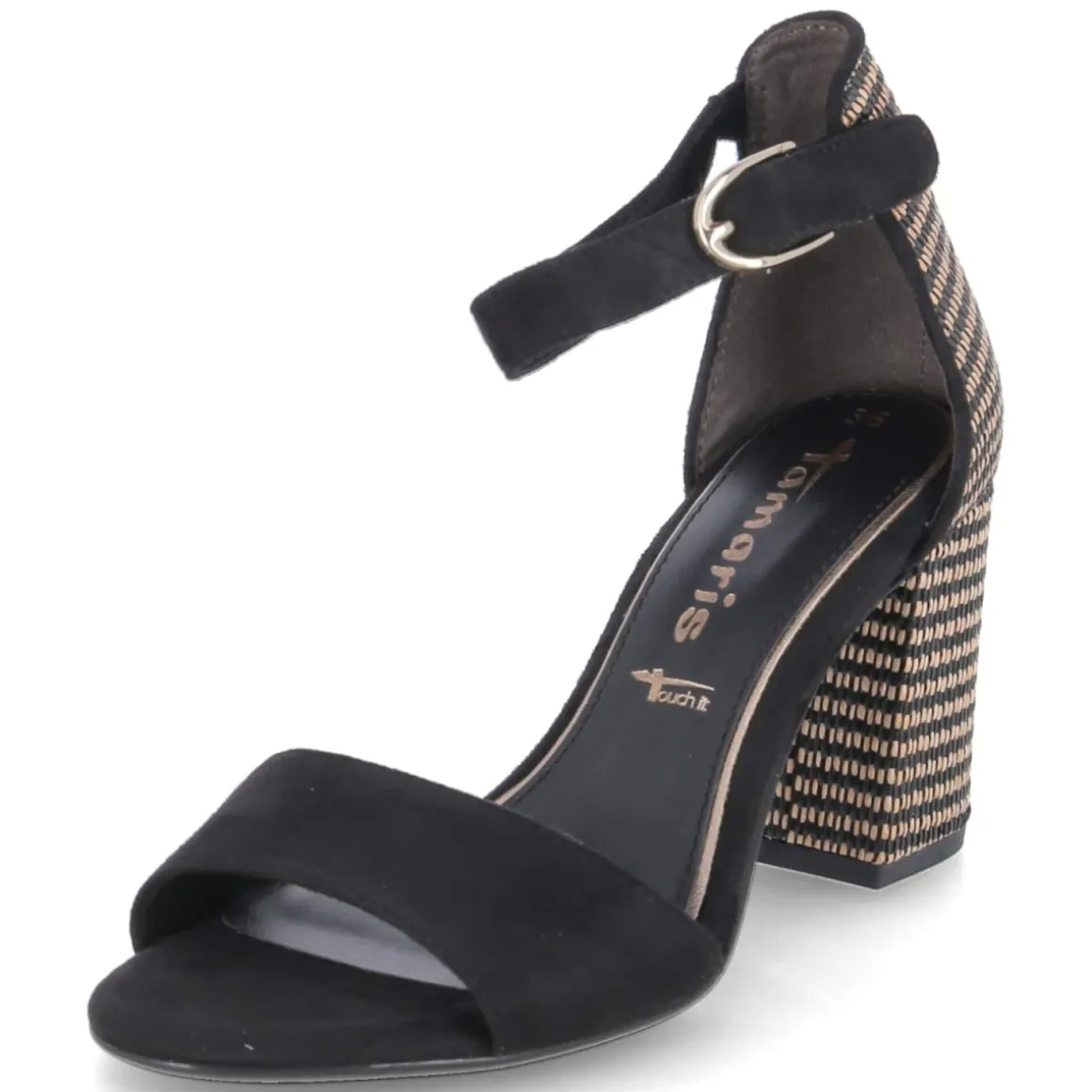 Die Riemchensandaletten von Tamaris bringen zeitlose Eleganz in Schwarz mit modernem Komfort zusammen. Der 8 cm hohe Blockabsatz sorgt für einen sicheren Stand, während die offene Schuhspitze und das feine Textil-Obermaterial dem Fuß schmeicheln. Aus veganen Materialien gefertigt, überzeugt das Modell mit einem weich gepolsterten Fußbett und einer rutschfesten Laufsohle für zuverlässigen Halt. Eine verstellbare Schnalle ermöglicht passgenauen Sitz, die Fersenpartie in Flechtoptik setzt einen dezenten Blickfang. Die Decksohle aus Textil und Synthetik ergänzt das angenehme Tragegefühl. Dank klassischer Farbgebung bestehen besonders gute Kombinationsmöglichkeiten; zudem fällt das Modell normal aus. Modetipp: Zu einem fließenden Midikleid oder zu weiten Anzughosen samt Satin-Top stylen, dazu eine strukturierte Clutch für einen stimmigen Abendlook.