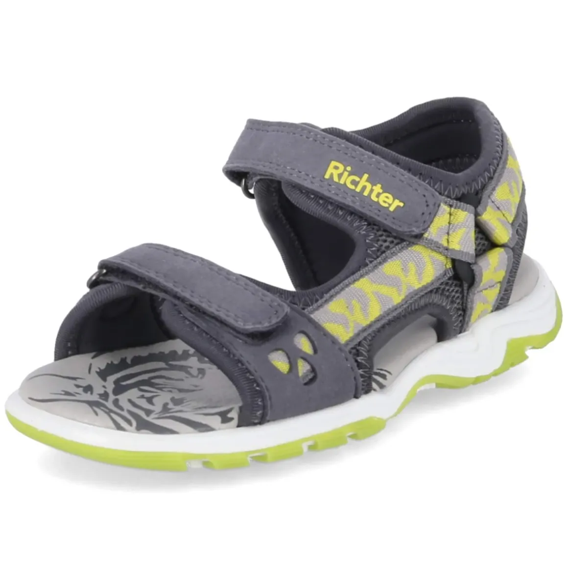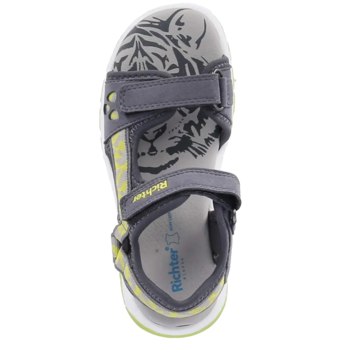 Diese Kinder-Sandalen von Richter verbinden Alltagstauglichkeit mit sommerlichem Komfort. Das robuste Textilobermaterial in Grau hält auch lebhaften Abenteuern stand, während gelbe Akzente frische Energie ins Design bringen. Innen sorgt ein leichtes Textilfutter für angenehmes Klima, die Decksohle aus Leder schmiegt sich weich an und unterstützt ein gutes Fußgefühl. Dank der praktischen Klettverschlüsse lassen sich Passform und Halt unkompliziert regulieren, die offene Schuhspitze bietet viel Bewegungsfreiheit. Die flexible, griffige und rutschhemmende Laufsohle gibt Sicherheit auf verschiedensten Untergründen – ideal für Spielplatz, Schulhof und Urlaub. Der Fit fällt normal aus und begeistert mit vertrauter Richter-Qualität. Modetipp: Harmoniert besonders schön mit sportlichen Shorts, gestreiften T-Shirts und leichten Hoodies; gelbe Details in Socken oder Cap greifen den Kontrast stilvoll auf.