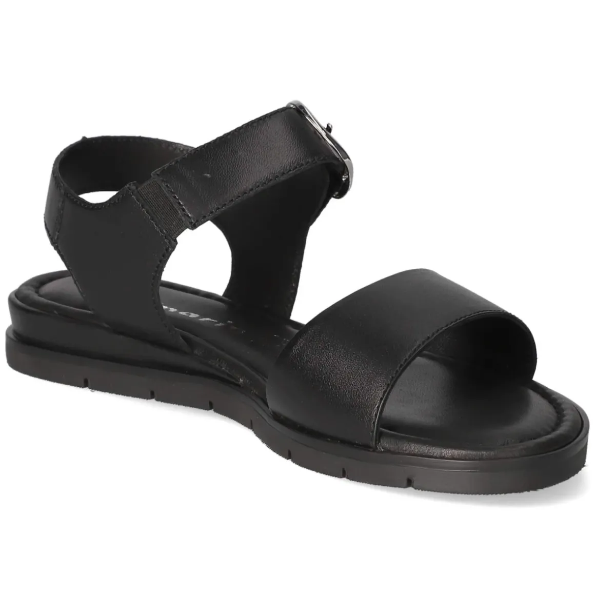 Diese Sandale von Tamaris vereint moderne Schlichtheit mit hohem Tragekomfort. Schwarzes Glattleder und die offene Schuhspitze setzen einen cleanen Akzent, während atmungsaktives Echtleder und ein weich gepolstertes Fußbett für ein angenehmes Klima und langanhaltende Bequemlichkeit sorgen. Der bequeme Klettverschluss ermöglicht eine individuelle Anpassung, die flexible, rutschhemmende Laufsohle gibt sicheren Halt auf verschiedensten Untergründen. Als Damenschuh für Erwachsene konzipiert und größengetreu ausfallend, begleitet dieses Modell zuverlässig durch Alltag und Freizeit. Ob zum Stadtbummel oder ins Büro, der dezente Look lässt sich vielseitig kombinieren und bleibt zeitlos. Modetipp: Mit fließender Culotte und strukturiertem Leinenblazer entsteht ein eleganter Sommerlook, der durch eine schwarze Crossbody-Bag harmonisch abgerundet wird.
