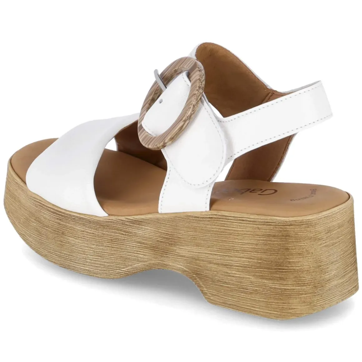 Diese Gabor Sandalen verbinden sommerliche Leichtigkeit mit hochwertiger Verarbeitung. Das Obermaterial aus weißem Glattleder wirkt klar und modern, während langlebiges Echtleder und ein angenehmes Lederfutter für ein wertiges Tragegefühl sorgen. Die offene Schuhspitze lässt Luft zirkulieren, die Decksohle aus Leder schmiegt sich angenehm an. Der 5,5 cm hohe Plateauabsatz sorgt für eine sanfte Erhöhung und entlastet den Fuß durch die ebenmäßige Auftrittsfläche. Ein bequemer Klettverschluss erleichtert das An- und Ausziehen; der Klettverschlussriemen mit Zierschnalle setzt einen edlen Akzent. Zusätzlich bietet die rutschhemmende Laufsohle im Clogdesign mit Holzoptik zuverlässige Stabilität. Das Modell fällt normal aus und eignet sich ideal für den Alltag wie auch für den Stadtbummel. Modetipp: Ton-in-Ton zu weißer Leinenhose und cremefarbenem Top kombinieren, dazu eine strukturierte Crossbody-Bag in Naturtönen.