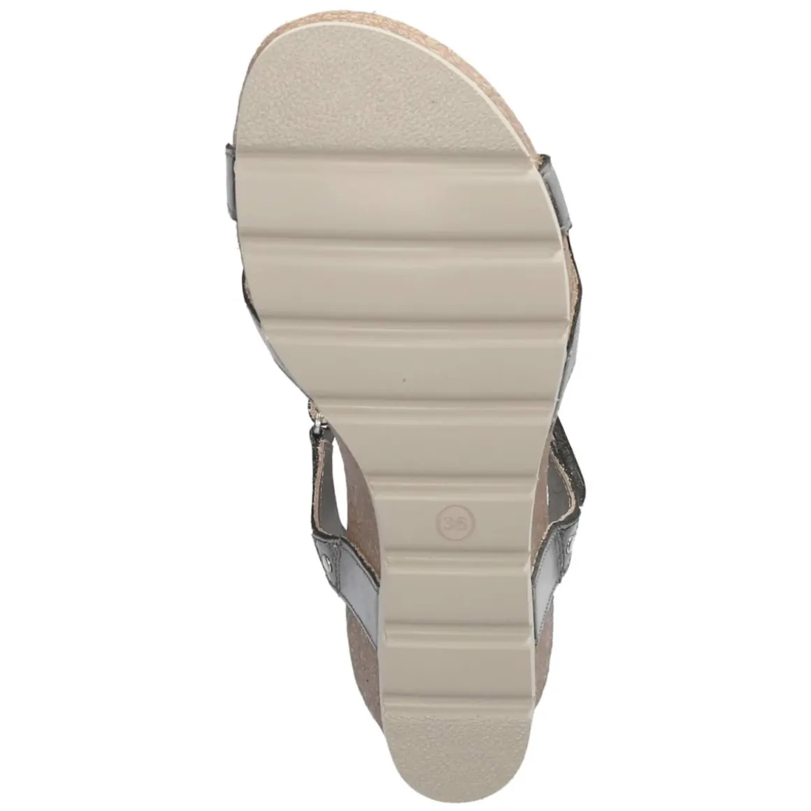 Die Sandaletten JULIA SHINE von Panama Jack vereinen funkelnden Auftritt mit durchdachtem Komfort. Das silberne Glattleder setzt elegante Akzente, während atmungsaktives Echtleder und die Lederdecksohle für ein angenehmes Fußklima sorgen. Ein gepolstertes Fußbett verwöhnt bei jedem Schritt, der 6 cm hohe Keilabsatz verlängert die Silhouette und bietet zugleich stabile Trittsicherheit. Zwei praktische Klettverschlüsse erlauben eine individuelle Anpassung am Fußrücken und am Knöchel, die flexible, rutschhemmende Laufsohle unterstützt verlässlichen Halt. Mit offener Schuhspitze und normaler Passform entsteht eine alltagstaugliche Sommer-Sandale, die vom Stadtbummel bis zur Abendverabredung überzeugt. Modetipp: Zu einem weißen Leinenkleid und einer filigranen Silberkette getragen, entsteht ein cleaner Look; mit hellen Denim-Shorts und Satin-Top wirkt der Metallic-Schimmer besonders modern.