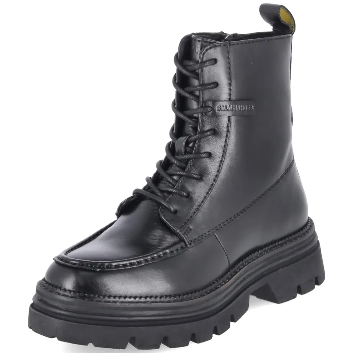 Der Salamander Schnürboots verbindet zeitlose Ästhetik mit Alltagstauglichkeit. Schwarzes Glattleder in langlebiger Qualität formt die runde Silhouette, während der 4,5 cm hohe Blockabsatz stabilen Halt gibt. Die Kombination aus Schnürung und seitlichem Reißverschluss erleichtert das An- und Ausziehen und ermöglicht eine präzise Weitenregulierung. Ein leichtes Fleecefutter wärmt an kühlen Tagen, die textile Decksohle sorgt für angenehmen Fußkontakt. Die rutschfeste Profilsohle bietet verlässliche Traktion, die verstärkte Ferse zusätzliche Stabilität. Eine markante Wulstnaht auf dem Schuhdeck unterstreicht den robust-eleganten Look. Der Schuh fällt normal aus und eignet sich damit ideal für die gewohnte Größe. Modetipp: Gelungen wirkt der Boot zu Cropped-Jeans und Wollmantel, ebenso zu Midikleid und blickdichter Strumpfhose für einen ausbalancierten, urbanen Stil.