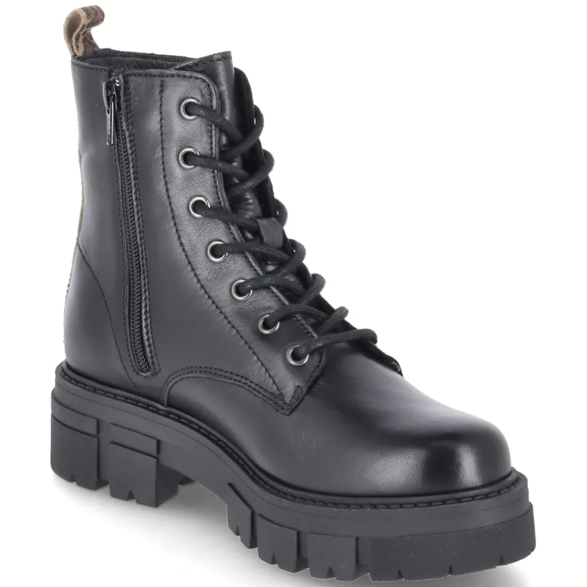 Apple of Eden präsentiert mit den Schnürboots CASTLE 1.1 einen urbanen Klassiker in schwarzem Glattleder. Die moderne Optik lebt von der klaren Linienführung, der runden Kappe und dem Mix aus Schnürung und seitlichem Reißverschluss, der das Anziehen erleichtert und die Passform justierbar hält. Langlebiges Echtleder und eine lederne Decksohle umschließen den Fuß, während das gepolsterte Fußbett den Alltag komfortabel begleitet. Der 5‑cm‑Blockabsatz harmoniert mit der robusten, rutschhemmenden Profilsohle samt ca. 3‑cm‑Plateau und sorgt für standfesten Lift. Eine verstärkte Ferse mit Zuglasche im Animal‑Print (Leopard) setzt einen dezenten Eyecatcher. Normal ausfallend und für erwachsene Damen konzipiert, wird der Boot zum vielseitigen Begleiter zwischen Büro und Freizeit. Modetipp: mit Cropped‑Denim und Wollmantel kombinieren, oder als Kontrast zu Midikleid und blickdichter Strumpfhose tragen.