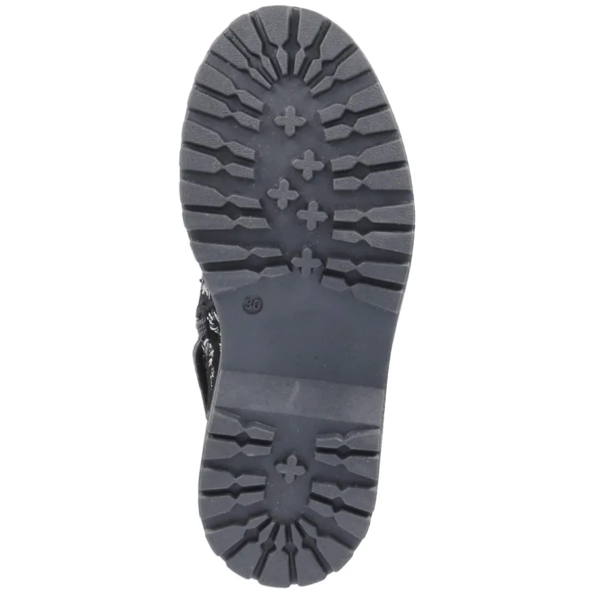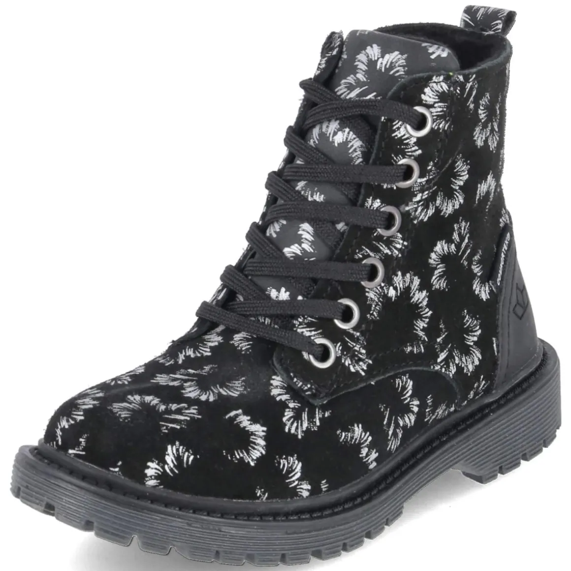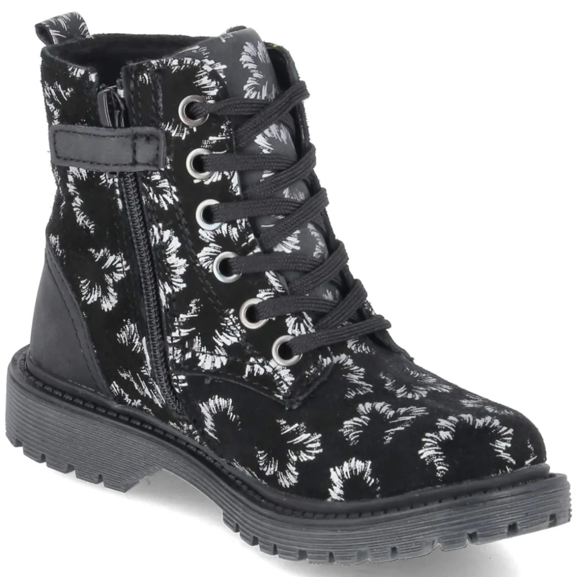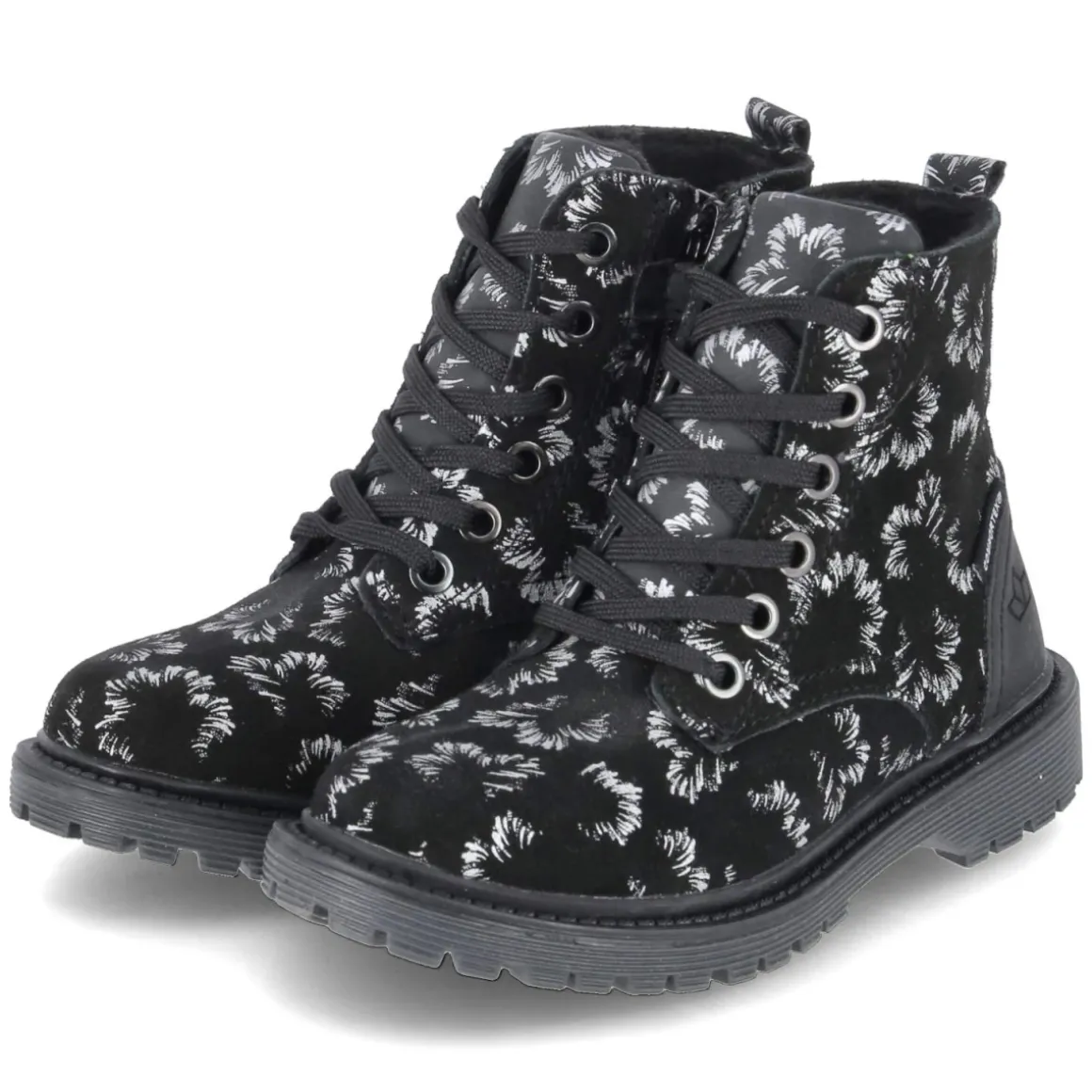 Der Schnürboots MALATI von Lico verbindet robuste Alltagstauglichkeit mit einem verspielten Look. Das Obermaterial aus Leder und Synthetik bildet einen wasserfesten Material-Mix, der Nässe zuverlässig abhält, während die runde Schuhspitze und der 2,5 cm hohe Blockabsatz für angenehmes Abrollen sorgen. Schnürung und praktischer Reißverschluss ermöglichen schnellen Einstieg und sicheren Halt. Innen wärmt ein leichtes Filzfutter, ergänzt durch eine weiche Decksohle aus Textil. Die rutschfeste Profilsohle gibt Stabilität auf nassen Wegen, die verstärkte Ferse unterstützt zusätzlich. Hingucker ist der abstrakte Blumenprint in Silber auf schwarzem Grund, der dem gemusterten Design eine edle Note verleiht. Fällt normal aus und passt ideal zu Schulweg, Spielplatz und Stadtbummel. Modetipp: Zu dunkler Skinny-Jeans, Strickpullover und gesteppter Pufferjacke wirken die silbernen Details besonders stimmig.