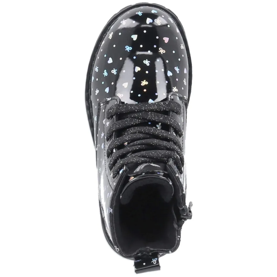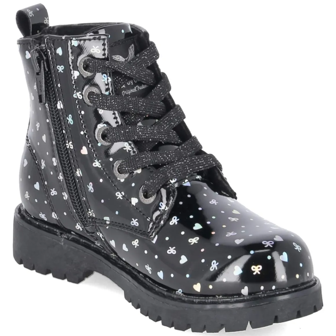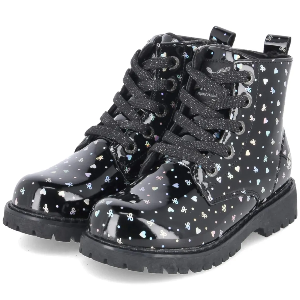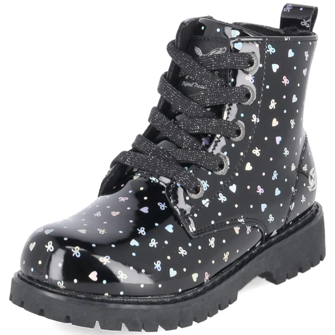 Diese Dockers Schnürboots für Kinder verbinden glänzende Eleganz mit alltagstauglichem Komfort. Die elegante Lackoptik in Schwarz erhält durch den silbernen, bunt schimmernden Print mit Herzchen und Schleifen eine verspielte Note, während Warmfutter und weiche Textildecksohle für Wohlgefühl an kühleren Tagen sorgen. Dank Schnürsenkeln und seitlichem Reißverschluss gelingt der unkomplizierte Einstieg, die Passform fällt normal aus. Der 2,5 cm hohe Blockabsatz, die rutschfeste Profilsohle und der verstärkte Fersenbereich geben sicheren Halt beim Rennen, Toben und auf dem Schulweg. Die runde Schuhspitze bietet genügend Zehenfreiheit, das synthetische Obermaterial zeigt sich pflegeleicht, und die Anziehlasche erleichtert das Anziehen zusätzlich. Modetipp: Besonders hübsch wirkt der Glanz zu Tüllrock und blickdichter Strumpfhose; für den Alltag entsteht mit lässiger Jeans und grobem Strick ein harmonischer Kontrast.