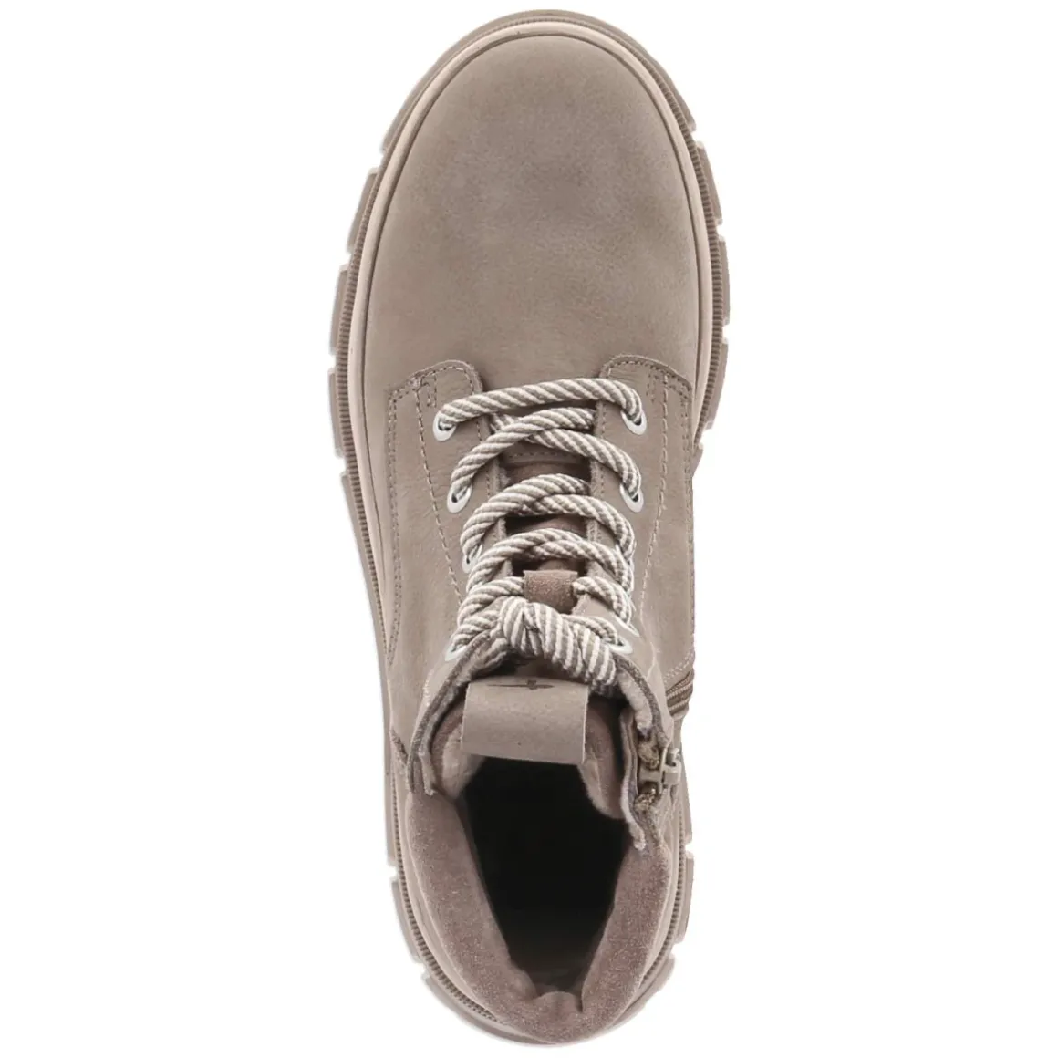 Der Schnürboot von Tamaris in edlem Taupe verbindet urbane Lässigkeit mit funktionaler Ausstattung. Weiches Rauleder mit langlebiger Qualität umschließt den Fuß, die runde Spitze und der verstärkte Fersenbereich sorgen für entspanntes Auftreten und zuverlässigen Halt. Schnürung und seitlicher Reißverschluss bieten flexible Anpassung und bequemes An- und Ausziehen. Ein leichtes Futter wärmt an kühlen Tagen, während das herausnehmbare, gut gepolsterte Wechselfußbett Komfort über viele Stunden liefert. Die rutschfeste Profilsohle greift sicher auf nassem Asphalt und Kopfsteinpflaster. Der gepolsterte Einstieg in Querstepp setzt einen dezenten Akzent und erhöht den Tragekomfort. Fällt normal aus und lässt sich mühelos in den Alltag integrieren – von Büro bis Wochenendspaziergang. Modetipp: Zu Strickkleid und Wollmantel entsteht ein moderner City-Look, alternativ zu Straight-Jeans und Oversize-Cardigan lässig und zeitlos.
