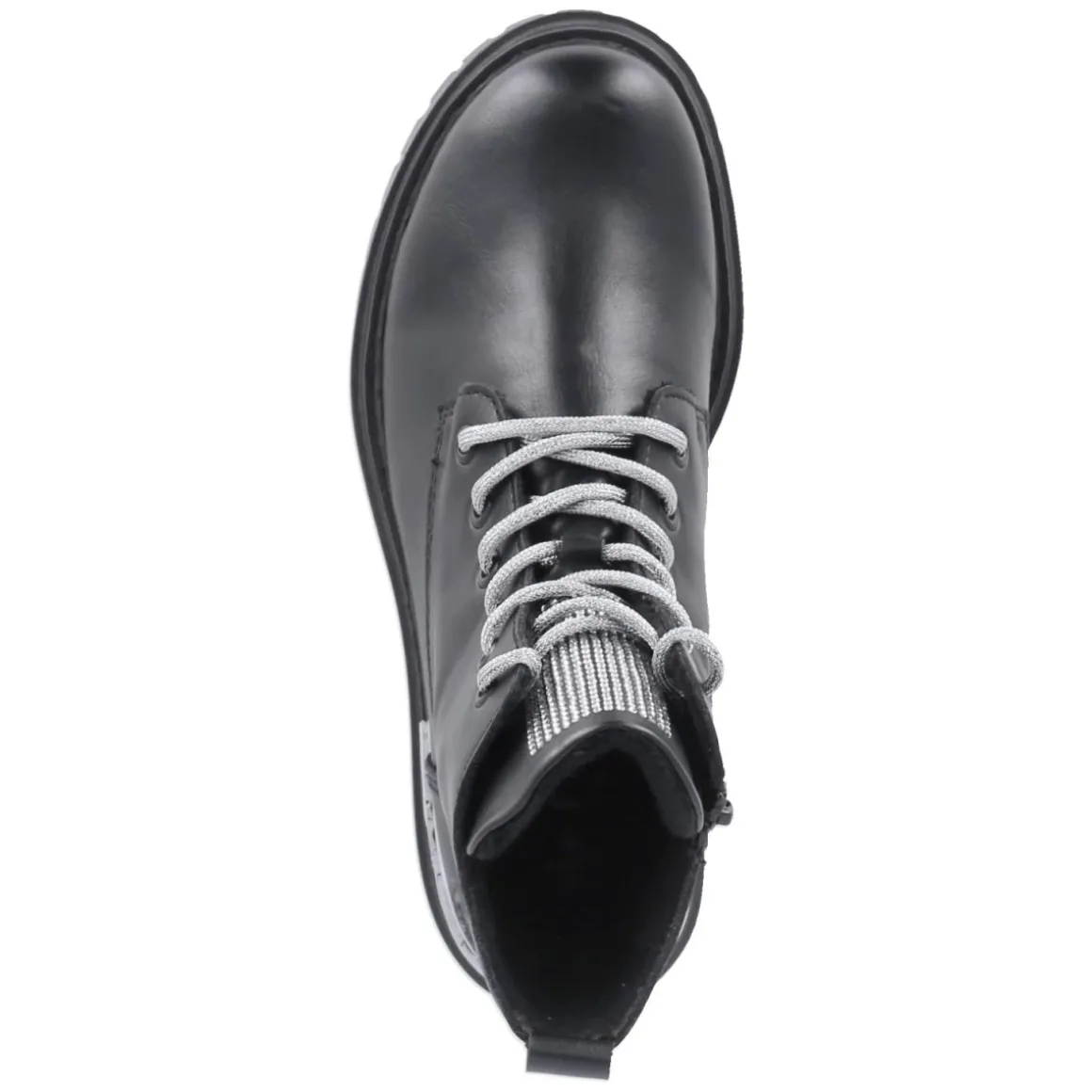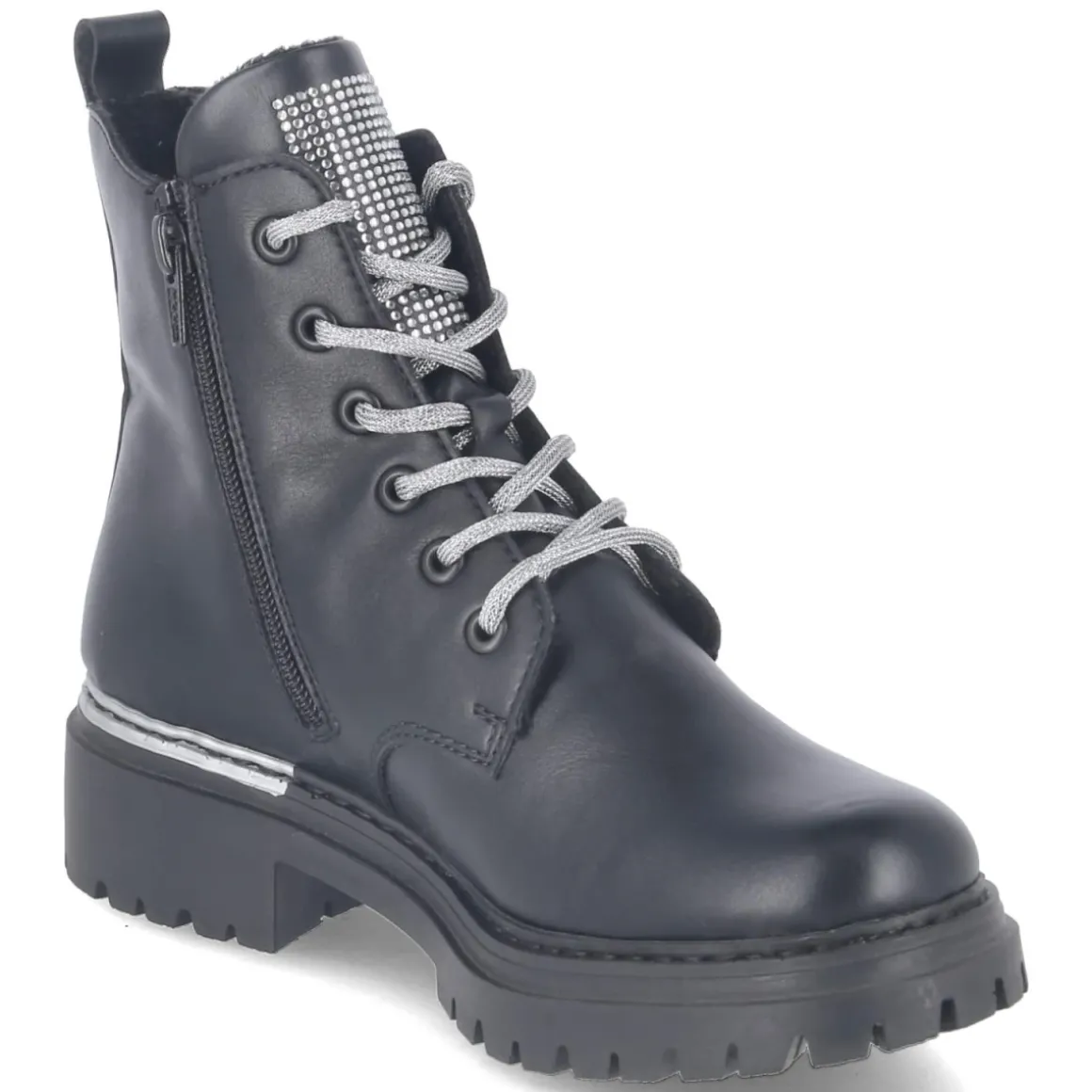 Der Rieker Schnürrboots bringt urbanen Komfort in klassischem Schwarz auf den Punkt. Das pflegeleichte Synthetik-Obermaterial zeigt sich mit dezenten silbernen Details, während der verstärkte Fersenbereich und die Anziehlasche praktische Alltagstauglichkeit sichern. Ein 4,5 cm hoher Blockabsatz sorgt für stabilen Stand, die runde Spitze und die flexible, rutschfeste Laufsohle erhöhen den Tragekomfort. Innen wärmt ein leichtes Futter an kühlen Tagen; die textile Decksohle unterstützt mit softer Dämpfung. Dank Kombination aus Schnürsenkeln und Reißverschluss gelingt der Einstieg mühelos. Die Passform fällt normal aus und eignet sich für erwachsene Trägerinnen, die ein modisches Design schätzen. Modetipp: Besonders stimmig zu Cropped-Jeans und Wollmantel oder zu Midikleid und blickdichter Strumpfhose.