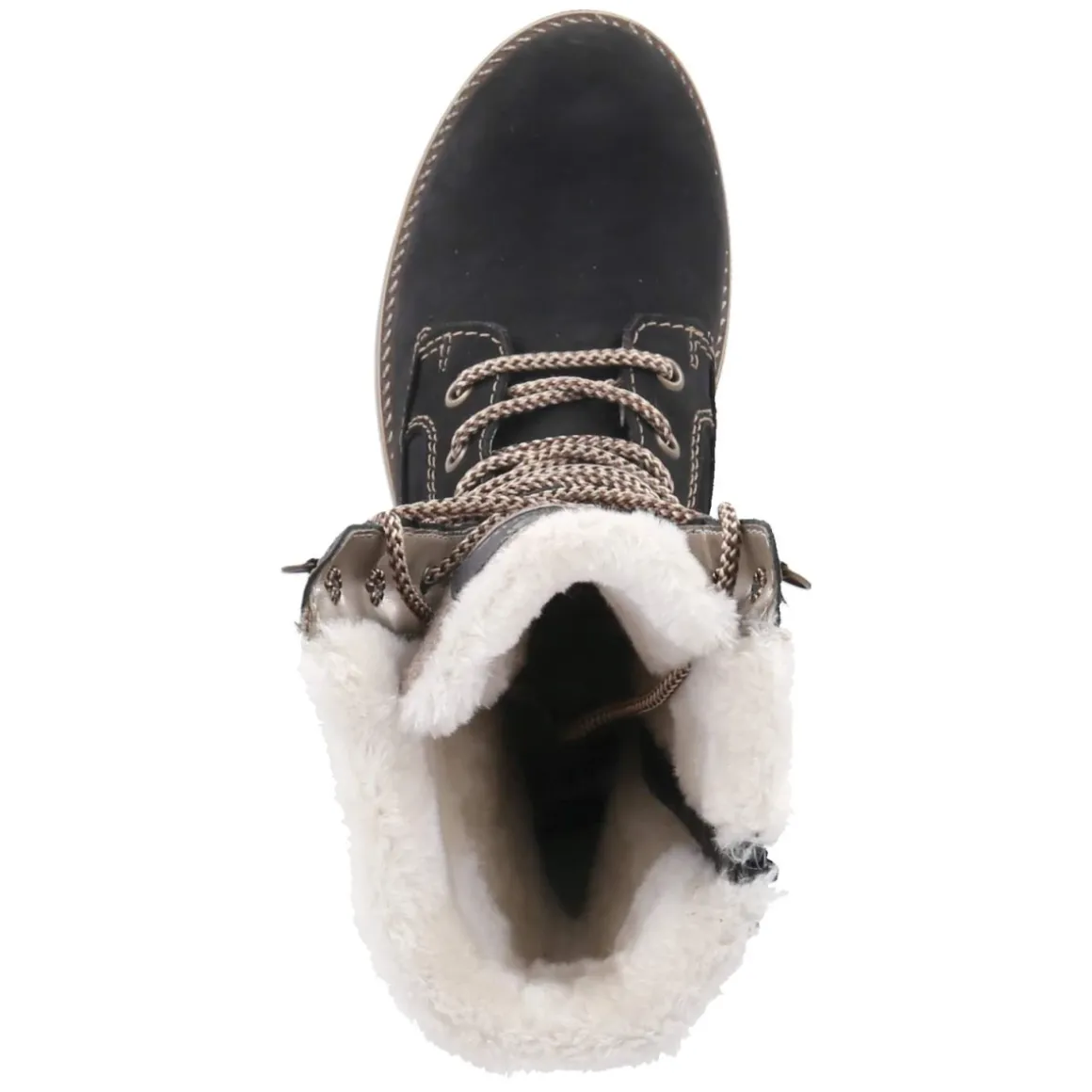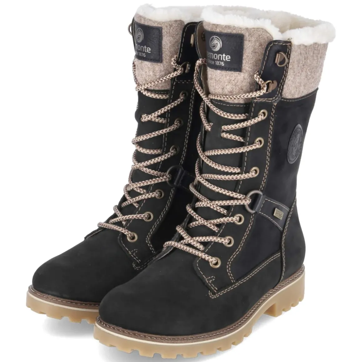 Der Damen-Schnürstiefel von Remonte verbindet funktionale Wärme mit zeitlosem Retrolook. Schwarzes Obermaterial aus Leder und Textil trifft auf einen weichen Schaft mit Filz-Oberteil und schmaler Kunstfellkrempe, darunter hält wärmendes Wollfutter die Füße angenehm temperiert. Das wasserfest verarbeitete Obermaterial unterstützt die wasserabweisende Ausstattung – ideal an nassen Tagen. Für alltagstauglichen Komfort sorgen die runde Spitze, eine textile Decksohle und das herausnehmbare Wechselfußbett. Schnürung und seitlicher Reißverschluss erleichtern den Einstieg, der 3 cm hohe Blockabsatz gibt stabilen Halt. Die flexible, rutschfeste Profilsohle begleitet sicher durch den Winter, dezente Markendetails vollenden den Look. Modetipp: Besonders stimmig zu Strickkleid, Wollmantel und blickdichter Strumpfhose für einen urbanen City-Style.