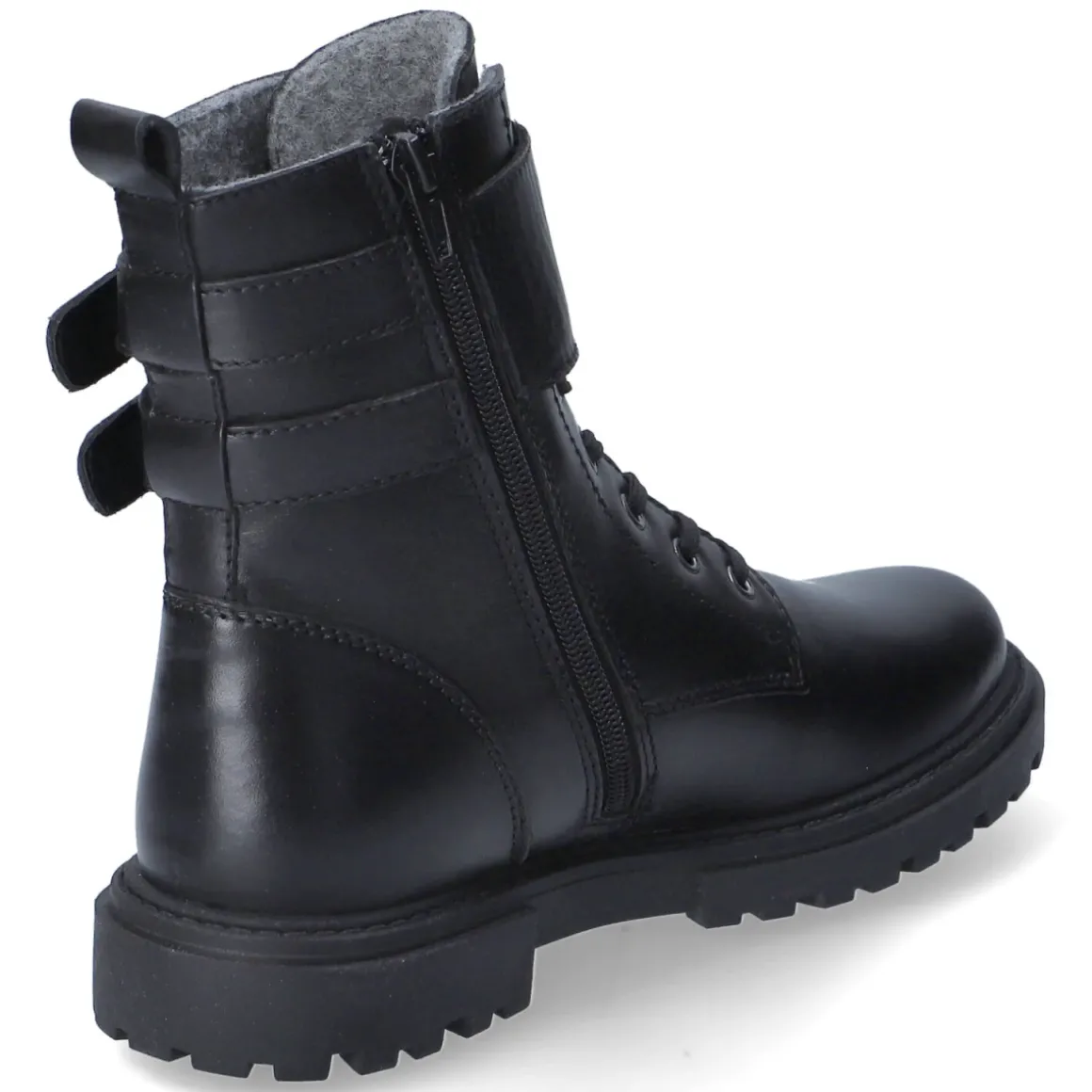 Schwarze Schnürstiefeletten von Richter, gefertigt aus langlebigem Echtleder mit markanten Ziernähten und dezenten Logos, verbinden urbanen Style mit Alltagstauglichkeit. Das warme, zugleich leichte Futter umschließt den Fuß angenehm, während die gepolsterte, textile Wechseldecksohle als komfortables Wechselfußbett zusätzlichen Komfort bringt. Schnürsenkel sorgen für präzise Anpassung, der bequemer Reißverschlußeinstieg ermöglicht schnelles An- und Ausziehen. Ein breiter Riemen mit zwei Schnallen setzt einen coolen Akzent, die Anziehlasche erleichtert das Handling. Runde Spitze, normal ausfallende Passform und eine stabile Laufsohle mit griffigem Profil plus Blockabsatz geben Halt auf kalten Wegen. Entwickelt für Jugendliche, die Wert auf Funktion und Stil legen. Modetipp: Zu schwarzer Skinny und Oversize-Parka kombinieren, dazu grob gestrickte Mütze – fertig ist der lässige Winter-Look.