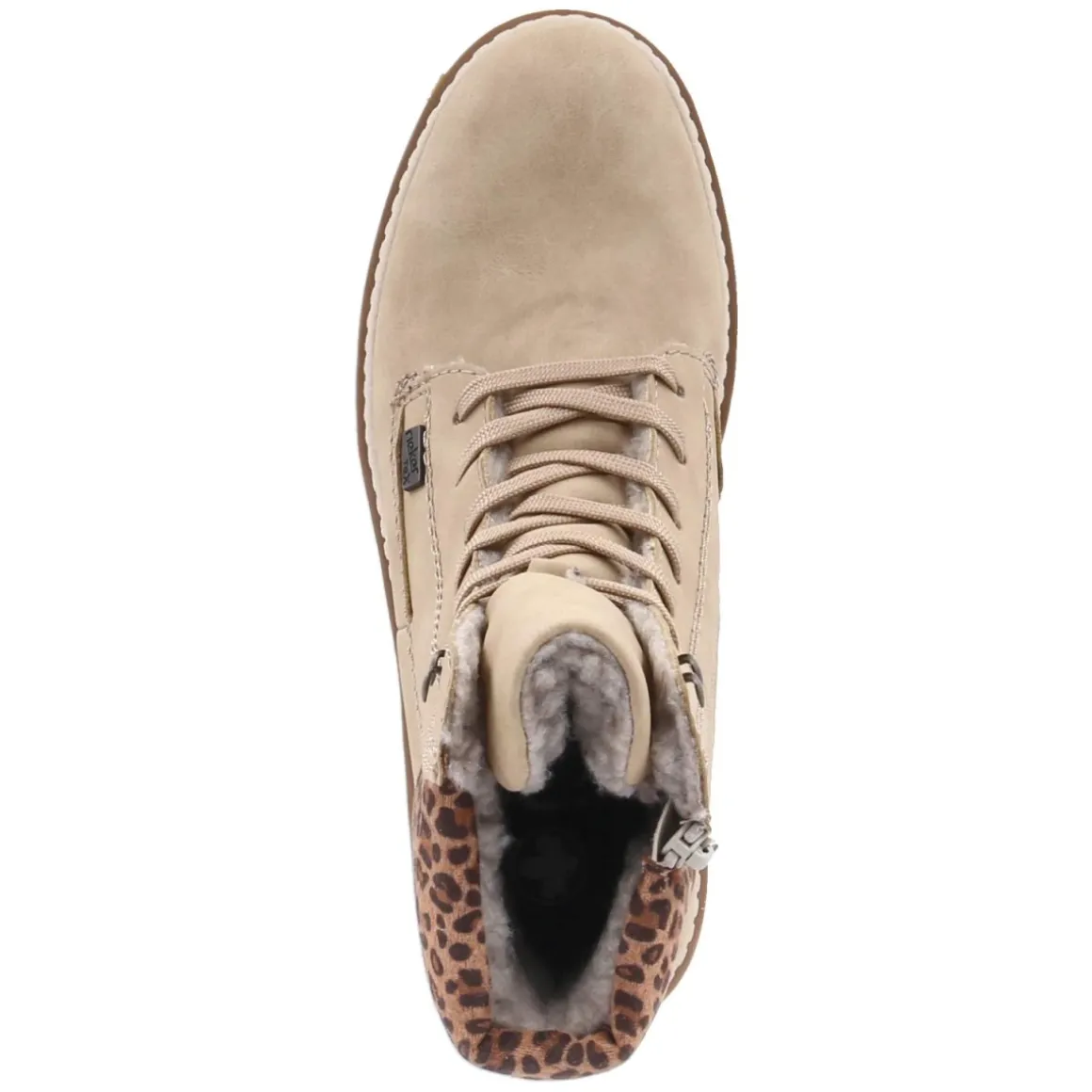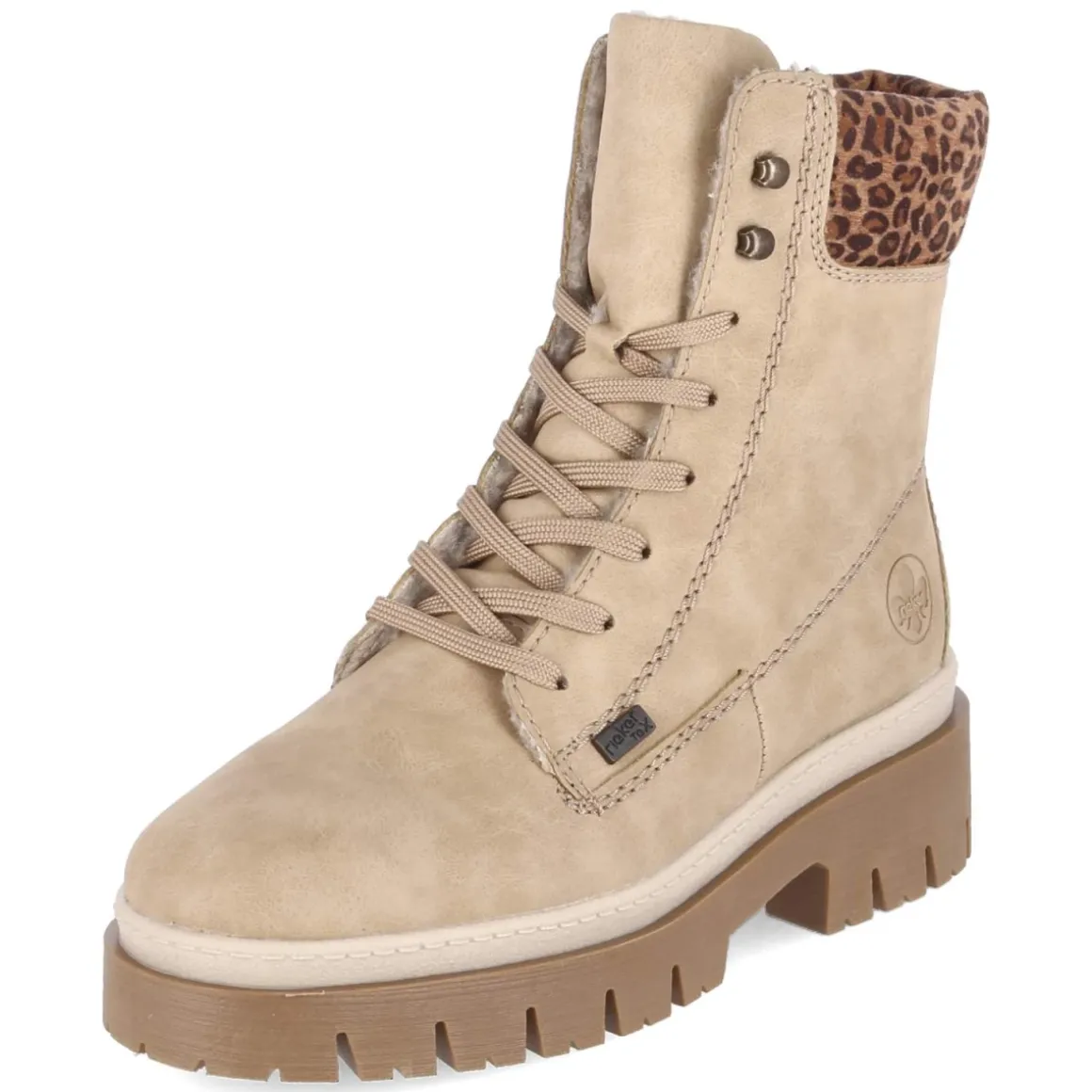 Diese Rieker Schnürstiefeletten verbinden urbane Lässigkeit mit zuverlässiger Funktion. Das beige Obermaterial aus Kunstleder harmoniert mit der runden Spitze und dem 5 cm hohen Blockabsatz, der einen stabilen Auftritt ermöglicht. Wasserfest und zugleich atmungsaktiv, schützt der Schuh an nassen Tagen und sorgt für ein angenehmes Fußklima. Warmes Teddyfutter verwöhnt an kalten Tagen, während der gepolsterte Einstieg im Leopardenlook einen modischen Akzent setzt. Der unkomplizierte Einstieg gelingt dank seitlichem Reißverschluss, die Schnürung optimiert die Passform. Ein textiles, gepolstertes Wechselfußbett steigert den Komfort, die verstärkte Ferse und die flexible, rutschfeste Profilsohle bieten Halt. Fällt normal aus. Modetipp: Zu Straight-Leg-Jeans, cremefarbenem Strickpullover und sandfarbenem Steppmantel entsteht ein zeitloser City-Look; das Leoparden-Detail greift Accessoires mit Animal-Print stilsicher auf.