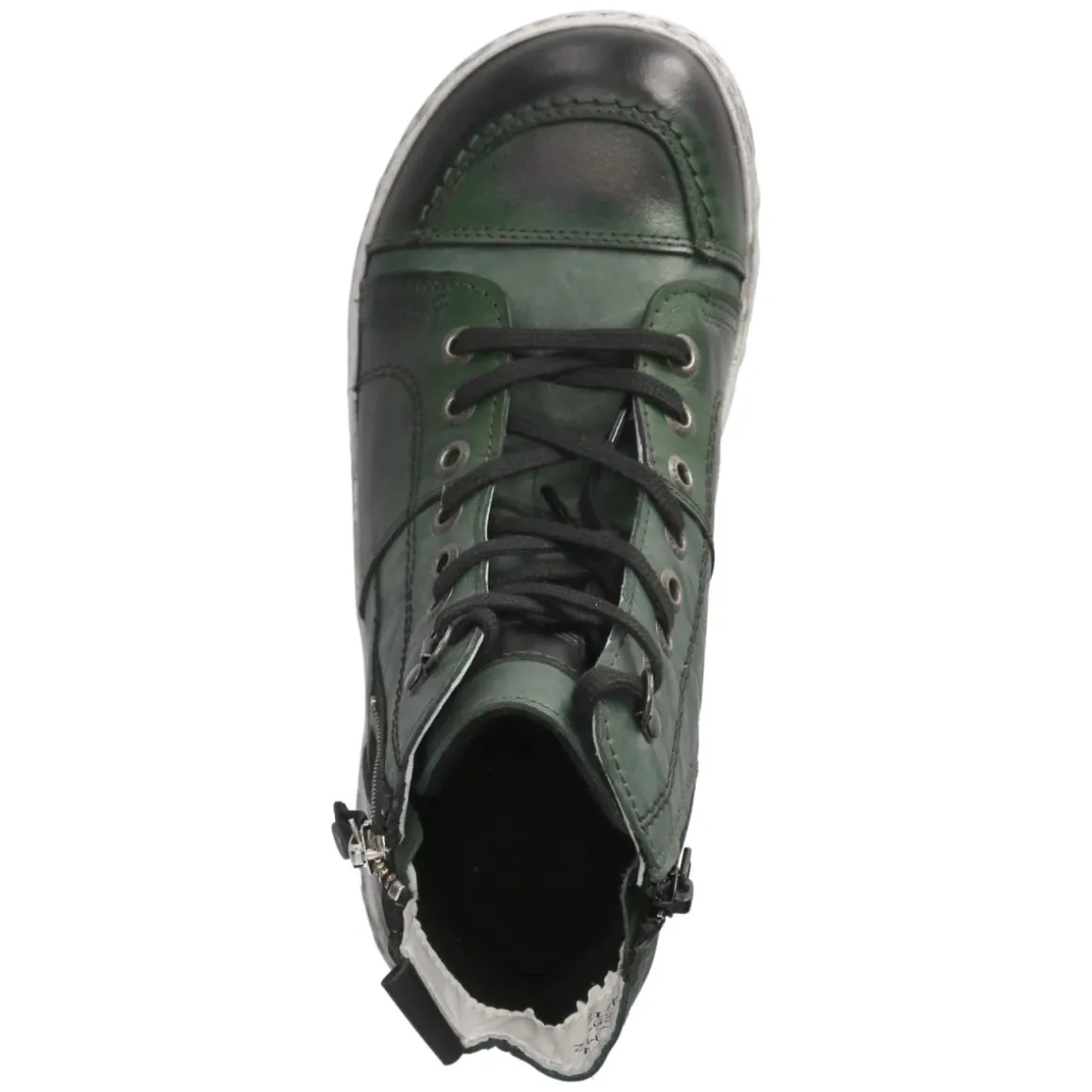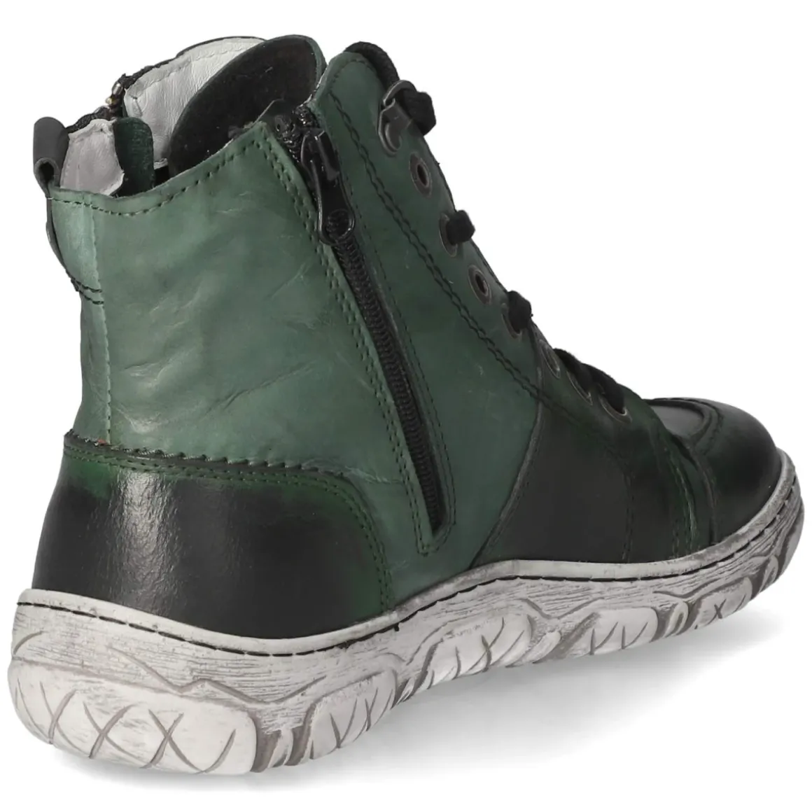 Krisbut Schnürstiefeletten vereinen modisches Design mit Alltagstauglichkeit. Das grüne Glattleder setzt ein stilvolles Statement, während die runde Schuhspitze und die Kombination aus Schnürsenkeln und zusätzlichem Reißverschluss für eine komfortable, individuell regulierbare Passform sorgen. Der Größenhinweis fällt normal aus bietet Planungssicherheit. Ein leichtes Futter wärmt an kühlen Tagen, ohne aufzutragen. Die textile Decksohle liegt angenehm am Fuß und kann dank Wechselfußbett unkompliziert gegen eigene Einlagen getauscht werden. Verstärkte Zehen- und Fersenbereiche erhöhen die Stabilität, die flexible, rutschfeste Laufsohle unterstützt sicheren Halt. Praktisch: Anziehhilfe und dezente Markendetails. Modetipp: Ton-in-Ton mit Khaki und Creme, Mom-Jeans und grobem Strick kombinieren oder als Kontrast zu Midikleid und blickdichter Strumpfhose tragen.