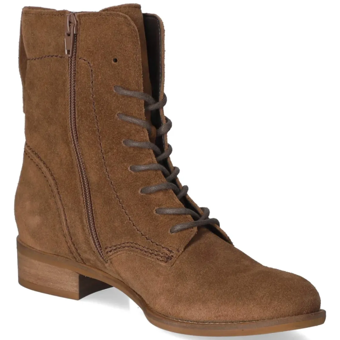 Die Gabor Schnürstiefeletten in warmem Braun kombinieren lässige Eleganz mit zuverlässigem Komfort. Weiches Rauleder aus langlebigem Echtleder sorgt für eine wertige Haptik, die runde Spitze bietet angenehme Zehenfreiheit. Der 3 cm hohe Blockabsatz entlastet bei langen Tagen, während die flexible, rutschfeste Sohle mit stabiler Auftrittsfläche Sicherheit gibt. Praktisch sind die Schnürung und der zusätzliche seitliche Reißverschluss für schnelles An- und Ausziehen, unterstützt von einer Anziehhilfe und der verstärkten Ferse. Ein komfortables, herausnehmbares Wechselfußbett mit Textildecksohle erhöht die Bequemlichkeit und lässt Raum für eigene Einlagen. Das Modell fällt normal aus und überzeugt mit sauberer Verarbeitung. Modetipp: Ton-in-Ton zu Straight-Leg-Jeans, Wollmantel und cognacfarbenen Accessoires entsteht ein harmonischer City-Look mit ruhiger Präsenz.