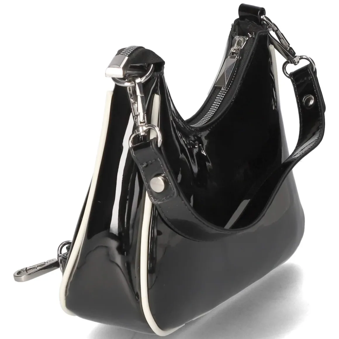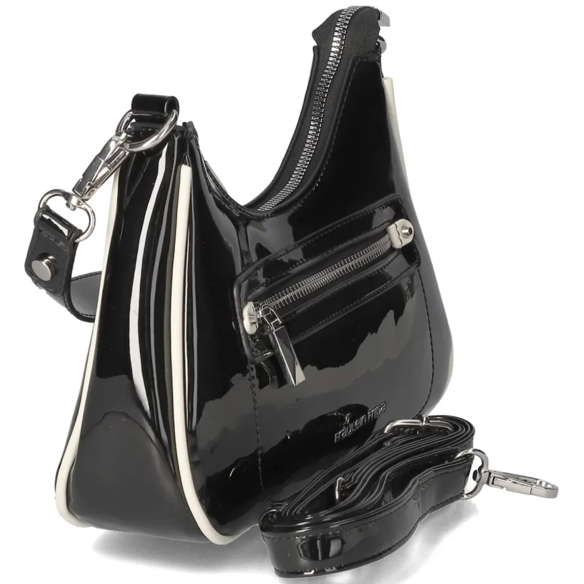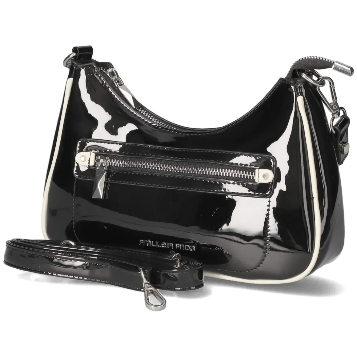 Diese Schultertasche verbindet markanten Glanz mit klarer Linienführung. Schwarze Lackoptik und präzise gesetzte weiße Akzente verleihen dem kompakten Format eine moderne Note. Mit ca. 17 x 26 x 6 cm und einem Volumen von etwa 2,5 Litern bietet das Modell ausreichend Platz für Essentials, während der Reißverschluss sicheren Halt gibt. Das Reißverschlusshauptfach ist durchdacht organisiert mit einem Steckfach und einem weiteren Reißverschlussfach; außen ergänzt ein separates Reißverschlussaußenfach die Struktur. Zwei abnehmbare Riemen, darunter ein verstellbarer Schulterriemen mit ca. 140 cm Länge, erlauben variabel Schulter- oder Crossbody-Trageweise. Ein vielseitiger Begleiter für den Tag und den Abend. Modetipp: Besonders effektvoll zu monochromen Schwarz-Weiß-Looks mit schmaler Anzughose und Loafern oder als glänzender Kontrast zu Raw-Denim und klassischem Trenchcoat.