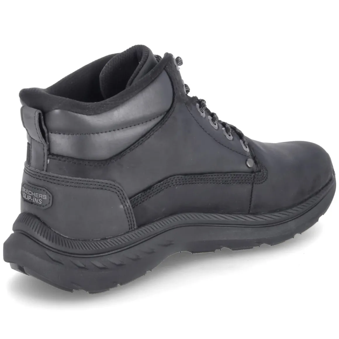 Der Slip-Ins Boot POLLARD – WAYLON von Skechers kombiniert einen robusten Material-Mix aus Leder und Synthetik mit sportiver Linienführung. In sattem Schwarz und mit runder Spitze gestaltet, passt der Herrenschuh mühelos zu urbanen wie lässigen Looks. Die bequeme Elastikschnürung erleichtert das Hineinschlüpfen und sorgt zugleich für sicheren Halt. Innen verwöhnt die beste Memory-Foam-Fußbettung mit weicher Dämpfung, während ein gepolsterter Einstieg und der verstärkte Fersenbereich zusätzlichen Komfort und Stabilität bieten. Die flexible, rutschhemmende GOODYEAR-Profilsohle greift zuverlässig, das geringe Gewicht unterstützt ein entspanntes Tragegefühl über den Tag. Der Schnitt fällt normal aus und überzeugt mit ausgewogenem Platzangebot im Vorfuß. Modetipp: Mit Raw-Denim, grauem Merinopullover und einer cleanen Utility-Jacke entsteht ein smarter City-Look.