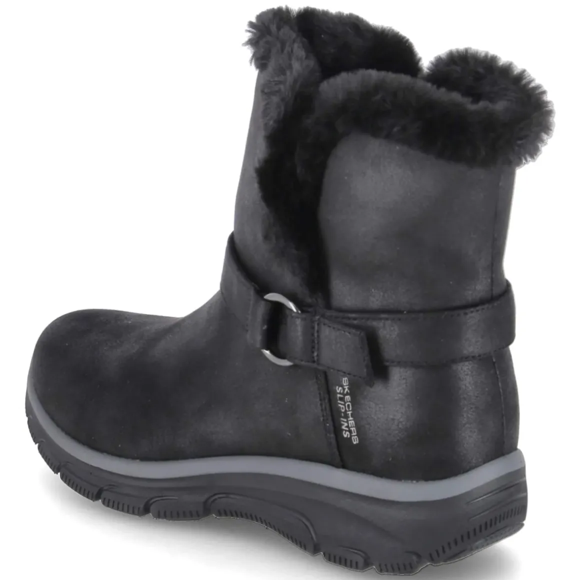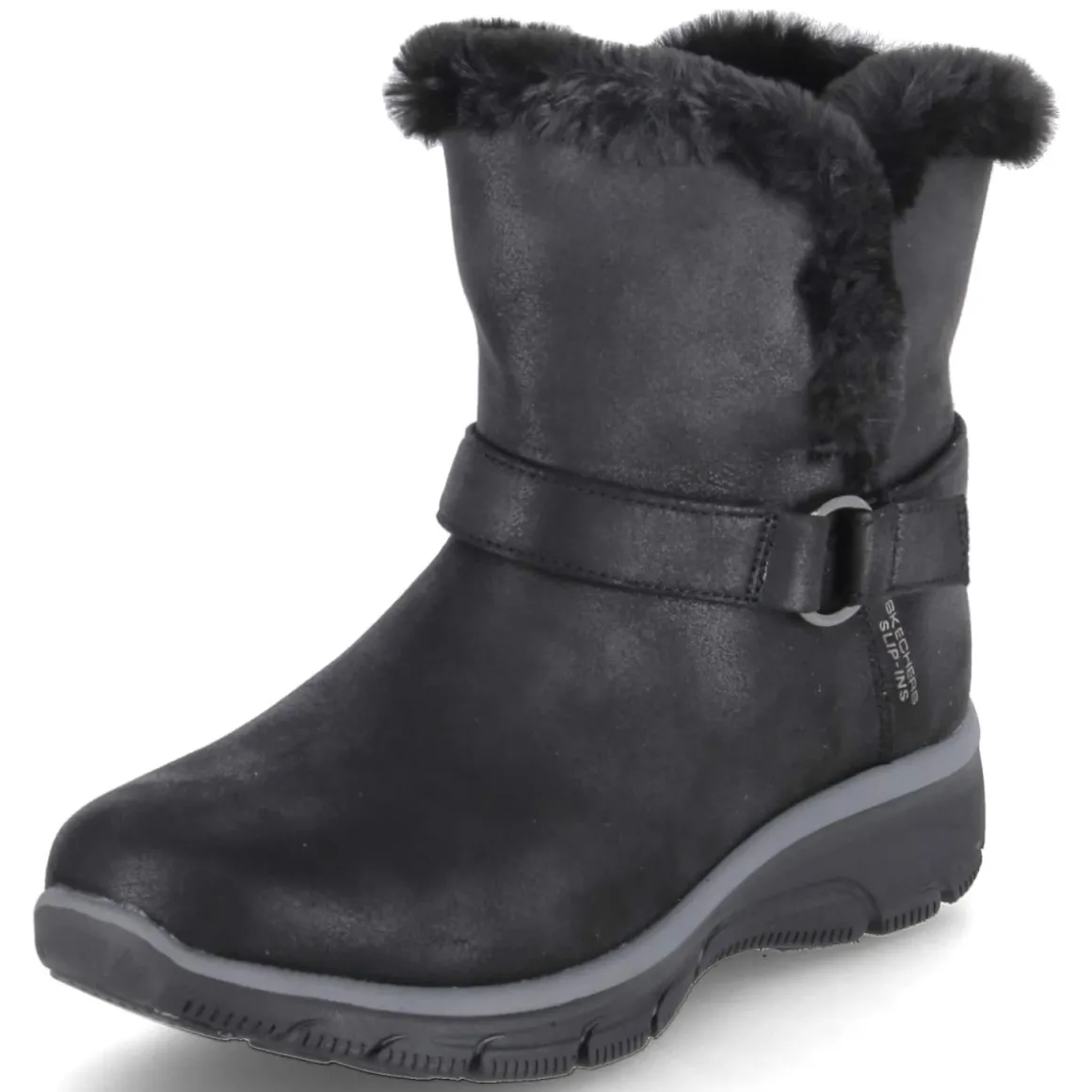 Der Skechers SLIP-INS DREAMERS MOVE vereint wintertauglichen Komfort mit urbaner Lässigkeit. Das wasserabweisende Textil-Obermaterial und das wärmende Futter halten angenehm trocken und warm, während die robuste, rutschhemmende Profilsohle sicheren Halt bietet. Der unkomplizierte Einstieg ohne Verschluss funktioniert dank Slip-Ins-Konstruktion besonders komfortabel; der weiche Kunstfellkragen schmiegt sich an und setzt einen gemütlichen Akzent. Für langanhaltenden Tragekomfort sorgt die hochwertige Memory-Foam-Fußbettung, die sich optimal anpasst. Schwarzes Design, runde Spitze und dezenter Riemen mit Metallring am Knöchelbereich geben dem Modell eine zeitlose Note. Aus veganen Materialien gefertigt und in der Passform regulär ausfallend, wird der Schuh zum vielseitigen Begleiter im Alltag. Modetipp: Besonders stimmig zu Steppmantel, Strickkleid und Thermo-Strumpfhose oder zu Wide-Leg-Jeans und Oversize-Parka.