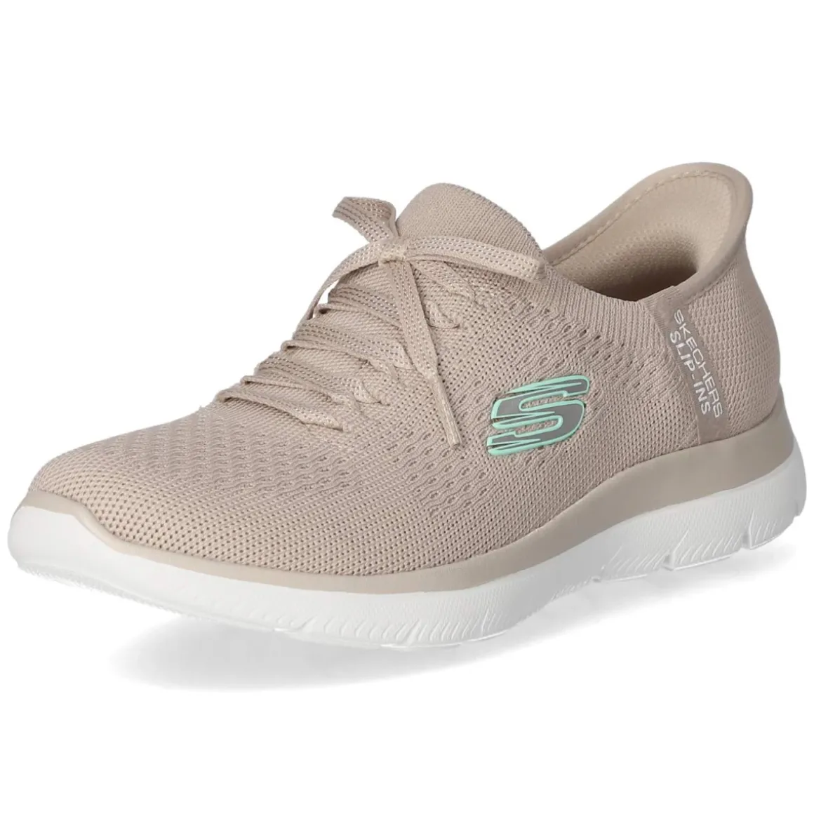 Der Skechers Slip-Ins Sneaker NEW DAILY vereint unkomplizierten Komfort mit einem femininen Twist. Das textile Obermaterial in vielseitigem Taupe wirkt leicht und atmungsaktiv, die runde Schuhspitze und die gepolsterte Ferse sorgen zusammen mit dem weichen, gepolsterten Fußbett für langanhaltendes Wohlgefühl. Durch den elastischen Einstieg gelingt der Slip-on-Komfort ohne Verschluss im Handumdrehen. Die flexible, rutschhemmende Laufsohle bietet verlässlichen Halt im Alltag, während das reflektierende Markenlogo subtile Akzente setzt. Eine zarte Zierschleife ergänzt das cleane Design. In der Maschine waschbar und aus veganen Materialien gefertigt, präsentiert sich der Schuh als pflegeleichter Begleiter. Fällt normal aus und eignet sich für Büro, Stadtbummel oder Reise. Modetipp: Mit Cropped-Jeans, Feinstrick und leichtem Trench entsteht ein zeitloser Look, der auch zu fließenden Midikleidern harmoniert.