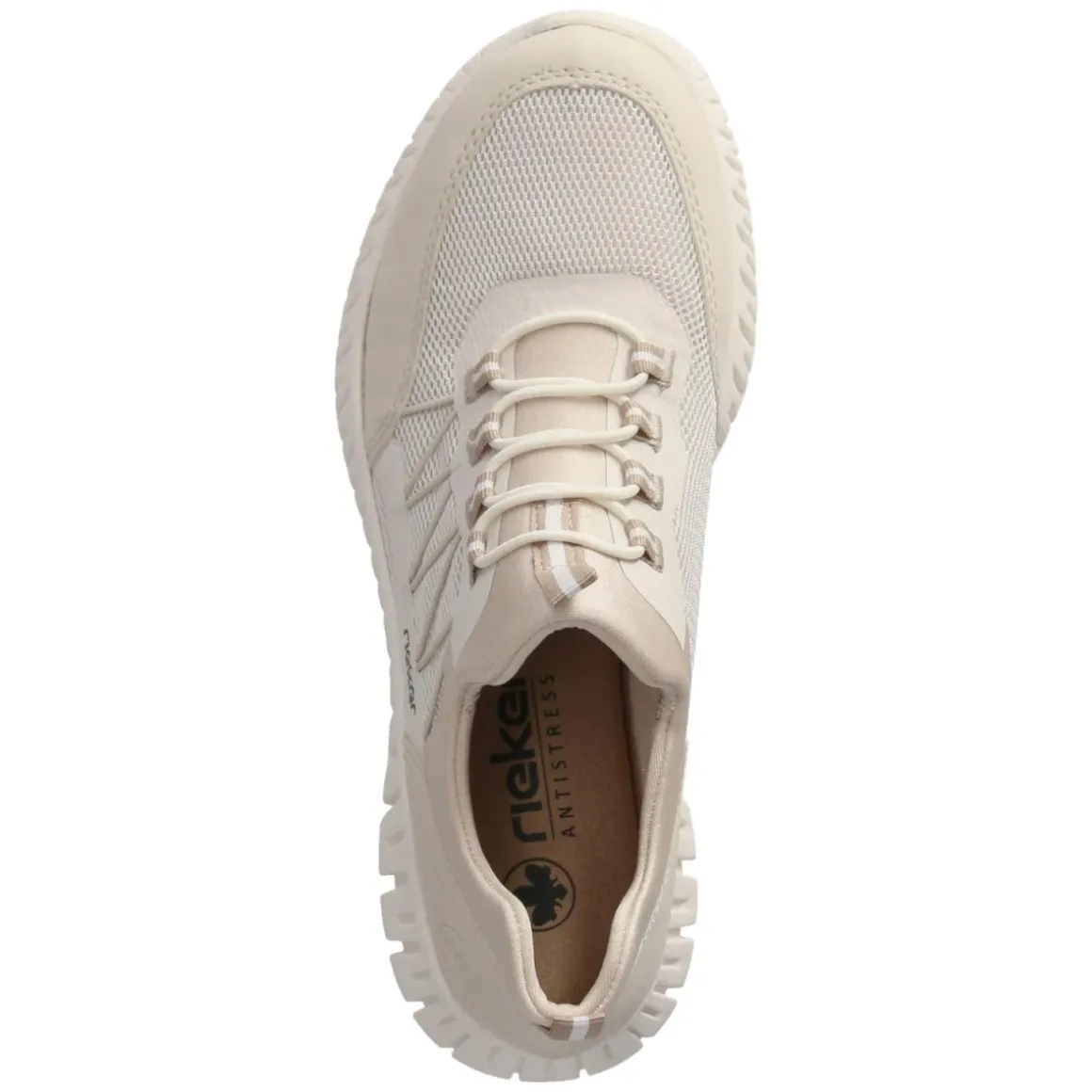 Der beige Slip-on-Sneaker von Rieker verbindet mühelose Bequemlichkeit mit sportlicher Eleganz. Der leichte Textil-Synthetik-Mix mit luftigen Mesh-Elementen sorgt für ein angenehmes Fußklima, während die runde Schuhspitze und die textile Decksohle den Tragekomfort abrunden. Elastikschnürung und Elastikband geben flexiblen Halt, zwei Anziehlaschen erleichtern den Einstieg, und der verstärkte Zehen- sowie Fersenbereich bietet zusätzliche Stabilität. Das weich gepolsterte Fußbett federt jeden Schritt, die flexible, rutschhemmende Laufsohle begleitet sicher durch den Tag. Ziernähte und dezente Markenlogos setzen zurückhaltende Akzente. Die Passform fällt normal aus und macht den Sneaker zum unkomplizierten Allrounder für den Alltag. Modetipp: Ton-in-Ton mit beiger Chino und cremefarbenem Stricktop entsteht ein edler, ruhiger Look, den ein Trenchcoat stilvoll komplettiert.