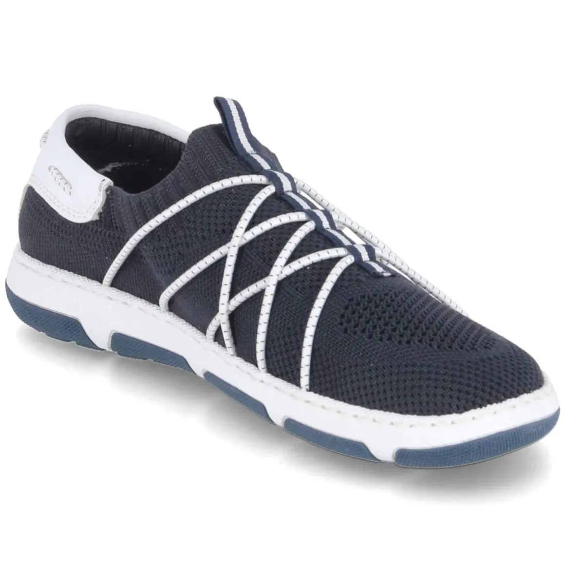 Der Rieker Slipper für Damen vereint sportliche Optik und modernen Material-Mix aus Textil und Synthetik in einem frischen Blauton. Elastikbänder über dem Spann und der stretchige Einstieg bieten bequemen Halt, während die verstärkte Ferse und die Anziehlasche das Hineinschlüpfen erleichtern. Das gepolsterte Wechselfußbett mit textiler Decksohle umhüllt den Fuß angenehm und lässt sich bei Bedarf gegen eigene Einlagen tauschen. Eine flexible, rutschhemmende Laufsohle sorgt für sicheren Grip im Alltag, die runde Schuhspitze schafft angenehme Zehenfreiheit. Dank schmaler Passform ideal für schlanke Füße und lange Tage auf den Beinen. Modetipp: Ton-in-Ton zur locker geschnittenen Chino und einem maritimen Bretonshirt tragen; filigraner Schmuck unterstreicht die moderne, sportlich-feminine Note.