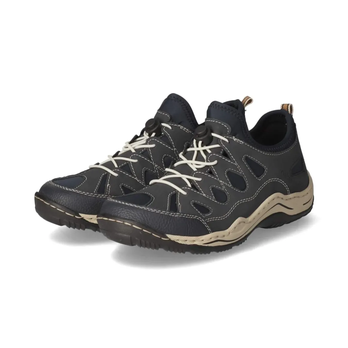 Sportlicher Damen-Slipper von Rieker, der mit leichtem Textil‑Synthetik‑Mix und klarer Linienführung überzeugt. Das blau getönte Obermaterial wird von weißen Ziernähten akzentuiert, während ein neoprenähnlicher Einstiegsstrumpf den Fuß soft umschließt und das Anziehen erleichtert. Der flexible Schnellverschluss sorgt für passgenauen Halt, die runde Schuhspitze und der verstärkte Zehenbereich bieten Alltagstauglichkeit. Dank Wechselfußbett mit textiler Decksohle lässt sich die Dämpfung individuell anpassen oder durch eigene Einlagen ersetzen. Seitliche Outcuts am Schnürblatt fördern die Luftzirkulation, die flexible Laufsohle mit leichtem Profil unterstützt natürliche Abrollbewegungen. Die Passform fällt normal aus und macht das Modell zum unkomplizierten Begleiter vom Stadtbummel bis zum Wochenendtrip. Modetipp: Zu gekürzten Jeans, weißem T‑Shirt und leichter Utility‑Jacke entsteht ein frischer Athleisure‑Look.