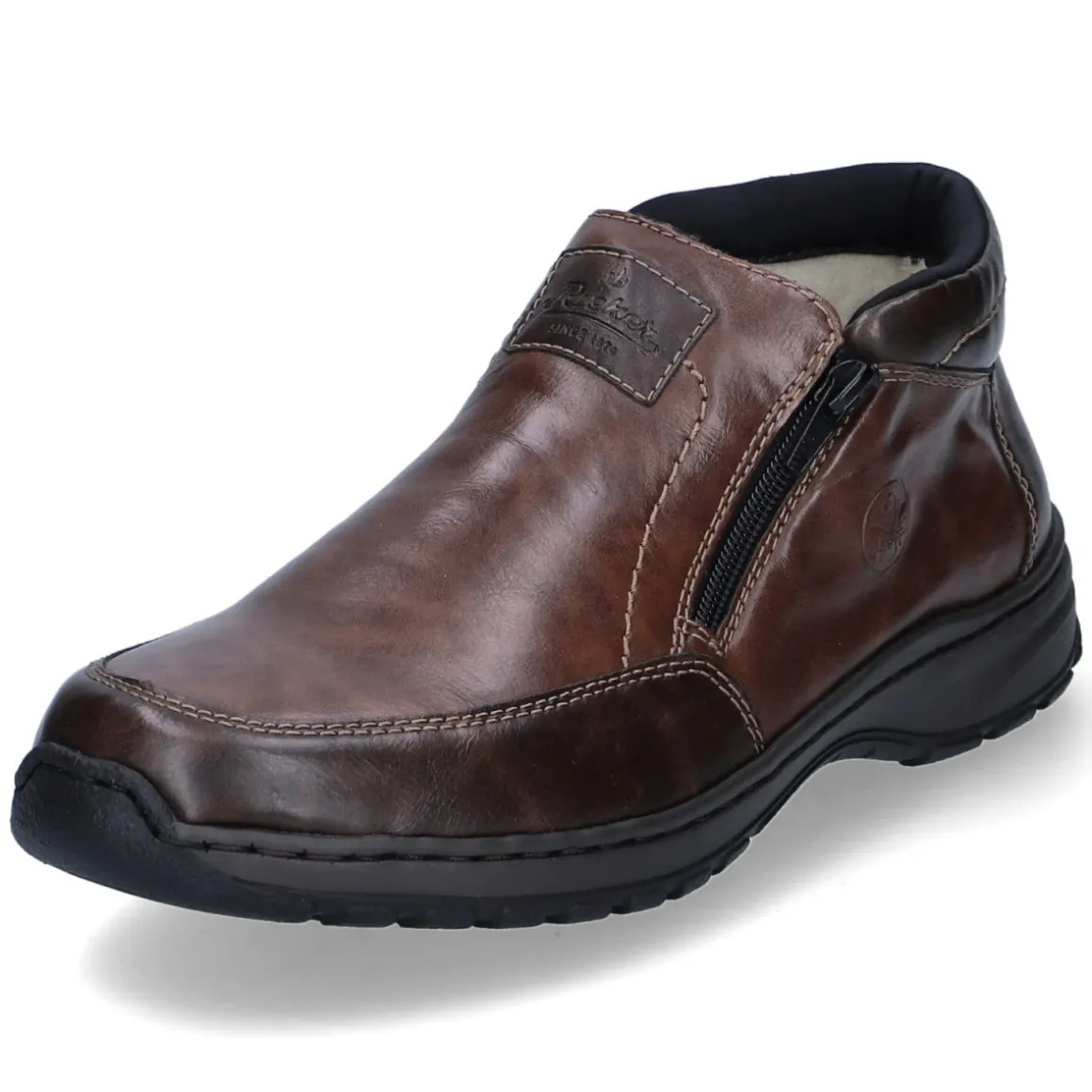 Der Herren-Slipper von Rieker in warmem Braun verbindet unkomplizierten Komfort mit wintertauglicher Behaglichkeit. Das pflegeleichte Kunstleder zeigt eine dezente Struktur, die zusammen mit der runden Schuhspitze für einen zeitlosen Look sorgt. Innen hält ein weiches Warmfutter die Füße angenehm temperiert, während die textile Decksohle ein sanftes Fußklima unterstützt. Seitliche Reißverschlüsse ermöglichen einen schnellen Einstieg und perfekten Sitz, und das Wechselfußbett lässt sich bei Bedarf gegen eigene Einlagen tauschen. Der Schnitt fällt normal aus und macht den Slipper zum zuverlässigen Begleiter für den Alltag. GÖTZ-Artikelnummer 162300210544. Modetipp: Zu dunkler Denim und grob gestricktem Pullover kombinieren, dazu ein Wollmantel in Cognac- oder Karamelltönen für ein stimmiges, urbanes Winter-Ensemble.