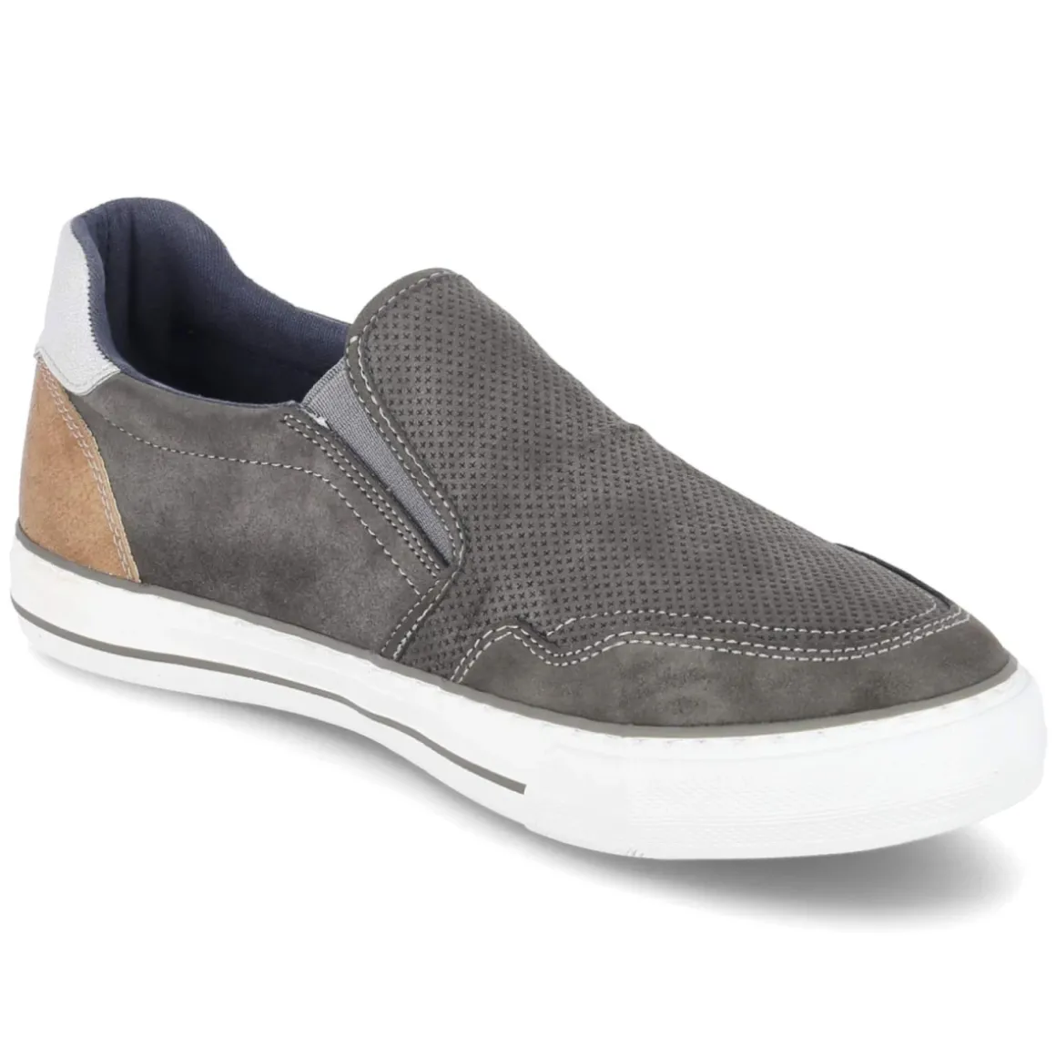 Der graue Herren-Slipper von Mustang verbindet lässige Optik mit Alltagstauglichkeit. Das Obermaterial aus Synthetik zeigt eine pflegeleichte Oberfläche, die durch ein leicht gestanztes Schuhdeck und braune Highlights sportiv betont wird. Beidseitige Elastikeinsätze erleichtern den Einstieg, während die runde Schuhspitze und der ohne Verschluss konzipierte Schaft für angenehmes Tragegefühl sorgen. Ein gepolstertes Fußbett und der leicht gepolsterte Einstieg bieten Komfort auf Schritt und Tritt. Verstärkte Zehen- und Fersenbereiche erhöhen die Stabilität, die flexible, rutschhemmende Cupsohle mit Bumpern gibt verlässlichen Grip. Typische Markendetails runden das Design ab. Die Passform fällt normal aus, die Decksohle aus Textil & Synthetik ergänzt das komfortable Innenleben. Modetipp: In Kombination mit hellen Chinos und meliertem T-Shirt entsteht ein smarter Casual-Look, den ein Canvas-Gürtel harmonisch aufgreift.