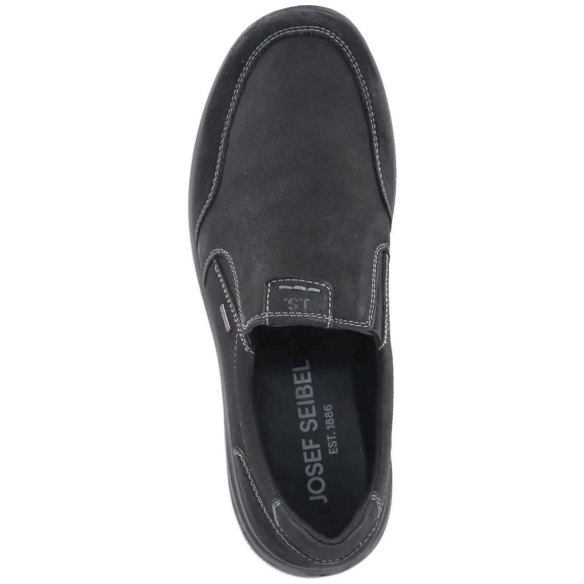 Der Slipper MARLEY 52 von Josef Seibel verbindet sportliche Optik mit funktionalem Komfort. Das Obermaterial aus hochwertigem Rauleder in klassischem Schwarz trifft auf einen ohne Verschluss gearbeiteten Einstieg mit seitlichen Elastikeinsätzen, der schnelles An- und Ausziehen ermöglicht. Ein weich gepolsterter Einstieg, das gepolsterte Fußbett und die Lederdecksohle sorgen für ein angenehm trockenes Fußklima. Wasserfest und zugleich atmungsaktiv konstruiert, bleibt der Schuh auch bei wechselhaftem Wetter verlässlich. Der verstärkte Fersen- und Zehenbereich erhöht die Formstabilität, die runde Spitze bietet entspannte Zehenfreiheit. Dank Wechselfußbett ist individuelle Anpassung möglich. Der Schnitt fällt normal aus und eignet sich für den Alltag ebenso wie für den smarten Casual-Auftritt. Modetipp: Mit gekrempelter Chino, Strickpolo und leichter Fieldjacket entsteht ein urbaner Look, der Eleganz und Sportlichkeit mühelos verbindet.