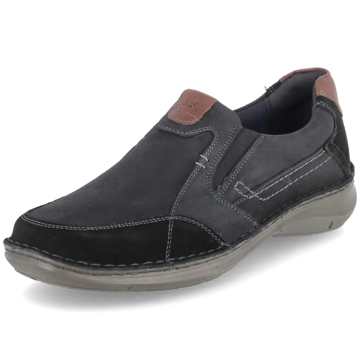 Der Slipper NEW ANVERS 01 von Josef Seibel vereint sportliche Optik und komfortorientiertes Design in einem zeitlosen Schwarz. Das weiche Rauleder schmiegt sich angenehm an den Fuß, während die hautfreundliche Lederdecksohle atmungsaktive Eigenschaften bietet. Ein karreeförmiger Leisten sorgt für moderne Linien und ausreichend Zehenfreiheit. Dank seitlicher Elastikeinsätze gelingt das Hineinschlüpfen mühelos, der leicht gepolsterte Einstiegsbereich erhöht den Tragekomfort zusätzlich. Die flexible Laufsohle mit leichtem Profil unterstützt sicheren Halt im Alltag, während verstärkte Zehen- und Fersenpartien für Langlebigkeit stehen. Das Wechselfußbett erlaubt individuelle Einlagen, Größen fallen verlässlich normal aus. Modetipp: Im Business-Casual mit schmaler Chino und Strickpolo oder am Wochenende mit dunkler Denim und leichter Hemdjacke wirkt der Slipper besonders souverän.