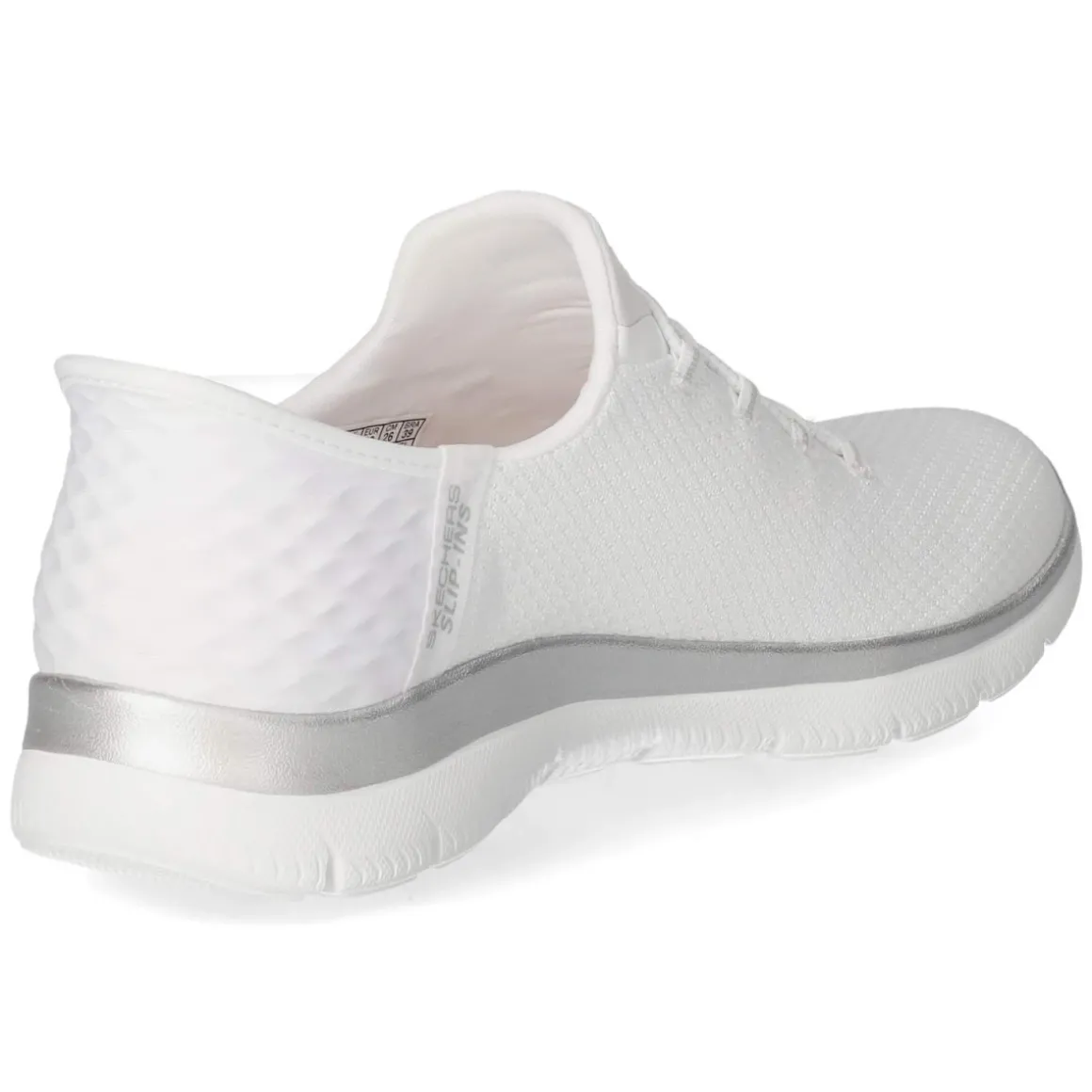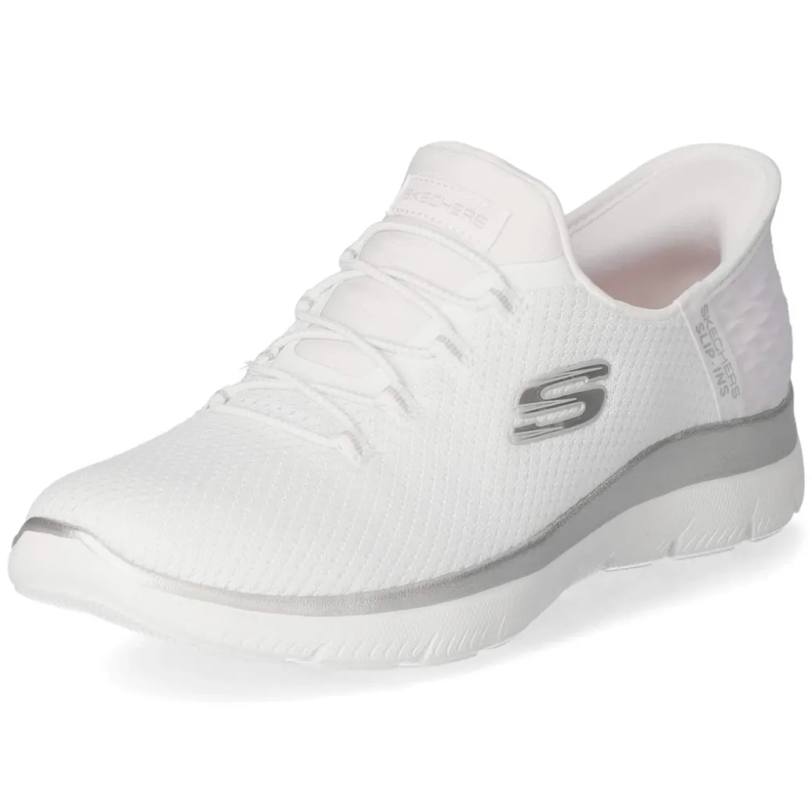 Der Sneaker DIAMOND DREAM von Skechers setzt auf cleanes Weiß und subtile, silberne Highlights, die jedem Look eine frische Note verleihen. Das textile Obermaterial schmeichelt dem Fuß, die runde Spitze sorgt für zeitlosen Appeal. Dank Slip-on-Design ohne Verschluss gelingt der Einstieg mühelos, während ein Elastikband den Sitz flexibel und sicher hält. Die bewährte Memory-Foam-Fußbettung polstert weich und unterstützt bei langen Tagen, die textile Decksohle liegt angenehm am Fuß. Eine flexible Laufsohle ermöglicht natürliche Abrollbewegungen und guten Grip im Alltag. Das Modell fällt normal aus und besteht aus veganen Materialien – ideal für bewusste Sneaker-Fans. Modetipp: Zu gerader Jeans, weißem T-Shirt und beigem Trenchcoat entsteht ein moderner City-Look, den silberner Schmuck perfekt auf die Schuhdetails abstimmt.