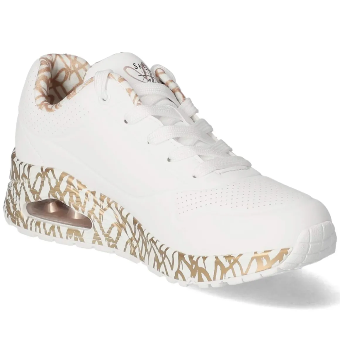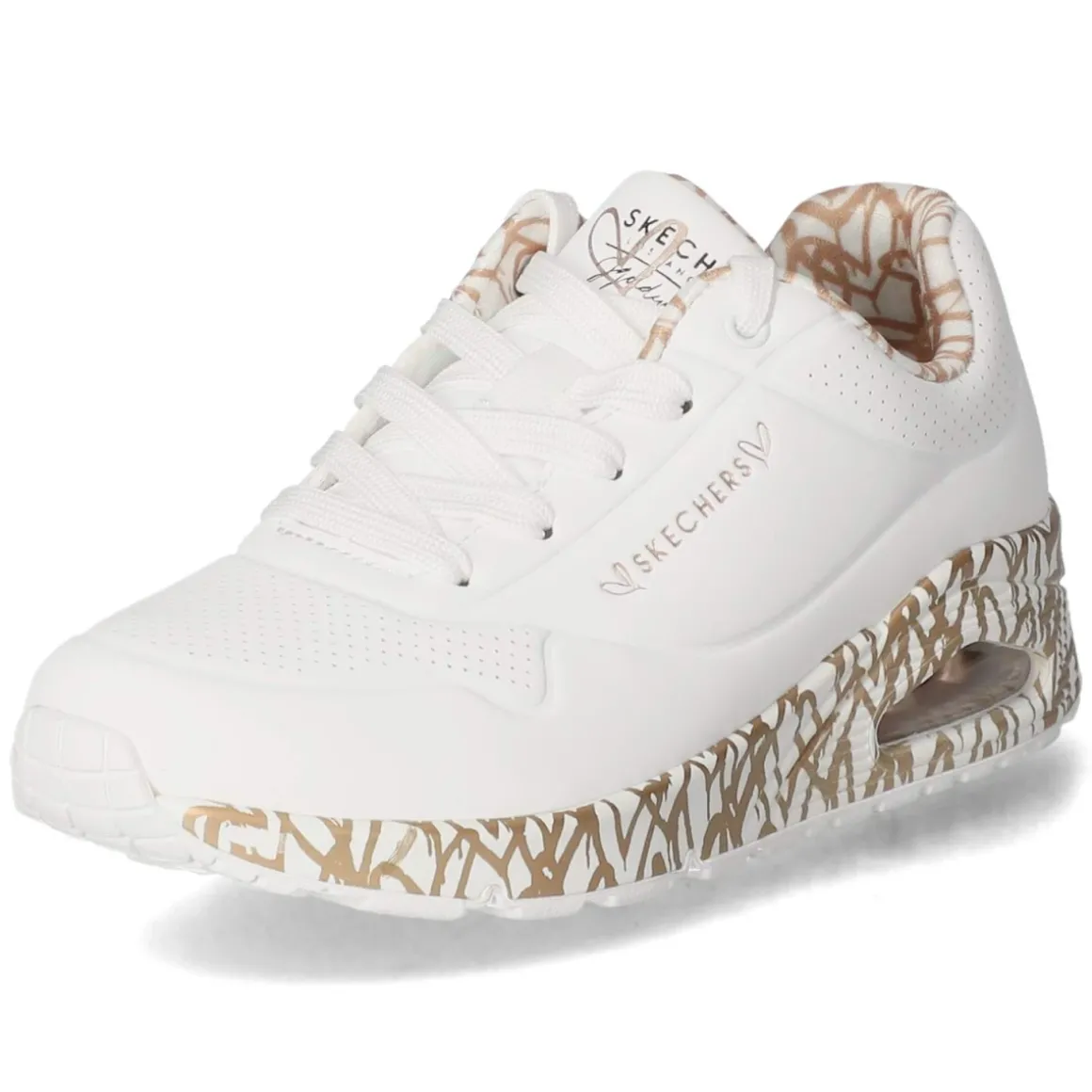 Der Sneaker LOVING LOVE von Skechers setzt auf eine klare, moderne Optik in strahlendem Weiß und wird so zum vielseitigen Begleiter im Alltag. Das hochwertig verarbeitete Synthetik-Obermaterial zeigt eine zeitgemäße Gestaltung, während die runde Spitze dem Fuß genügend Raum lässt. Ein weich gepolstertes Fußbett und die Textildecksohle sorgen für ein angenehm gedämpftes Tragegefühl, das auch längere Wege komfortabel macht. Dank klassischer Schnürung lässt sich die Passform individuell anpassen und bleibt gleichzeitig formstabil. Die moderne Anmutung harmoniert mit sportlichen wie urbanen Looks und verleiht Outfits eine frische Note. Der Größenhinweis fällt normal aus und erleichtert die Wahl der gewohnten Größe. Modetipp: Zu weitem Denim, weißem Oversize-Hemd und feinen Pastell-Socken entsteht ein cleaner, aktueller City-Look mit lässiger Eleganz.
