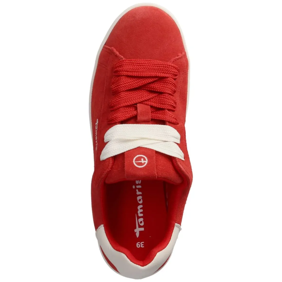 Mit sattem Rot und weißfarbenen Glattleder-Akzenten setzt der Tamaris Sneaker einen frischen Akzent im Alltag. Das Obermaterial aus robustem Echtleder in weichem Rauleder-Finish sorgt zusammen mit der runden Schuhspitze und klassischen Schnürsenkeln für einen sympathischen Look. Komfort steht im Mittelpunkt: gepolsterter Einstieg, textiler Decksohle und ein gepolstertes, herausnehmbares Wechselfußbett umschließen den Fuß angenehm. Der verstärkte Zehen- und Fersenbereich gibt Halt, während die flexible, rutschhemmende Laufsohle verlässlichen Grip bietet. Feine Ziernähte und dezente Markendetails runden das Design ab. Größenhinweis: fällt normal aus, ideal für Damen in der Zielgruppe Erwachsene, die einen vielseitigen Sneaker suchen. Modetipp: Besonders harmonisch wirkt der Rotton zu cremefarbener Wide-Leg-Jeans und Off-White-Lederjacke, dazu filigraner Goldschmuck für einen eleganten Kontrast.