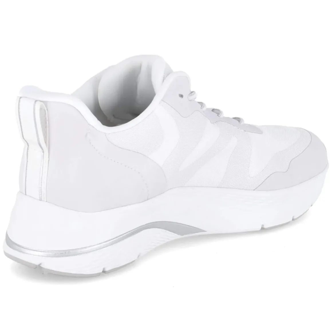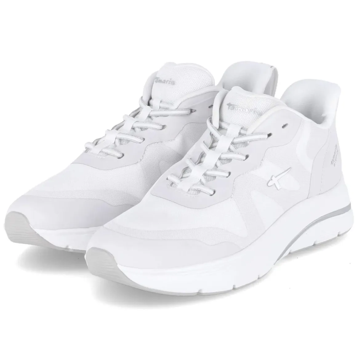Der weiße Damen-Sneaker von Tamaris setzt auf eine klare, moderne Linienführung und trägt sich dank kluger Materialmischung besonders angenehm. Obermaterial aus Textil und Synthetik schmiegt sich leicht an, während ein Elastikband in Schnüroptik für den lässigen Look sorgt und das Hineinschlüpfen ohne Verschluss erleichtert. Eine textile Decksohle und das komfortable, herausnehmbare Wechselfußbett bieten weiche Dämpfung im Alltag. Verstärkter Zehen- und Fersenbereich erhöht die Formstabilität, die runde Spitze schafft Bewegungsfreiheit. Silberne Akzente setzen dezente Highlights, die flexible, rutschfeste Laufsohle gibt sicheren Halt. Passform fällt normal aus. Gefertigt aus veganen Materialien. Modetipp: Besonders stimmig wirkt das Modell zu hellen Denim-Looks und einem luftigen Stricktop.