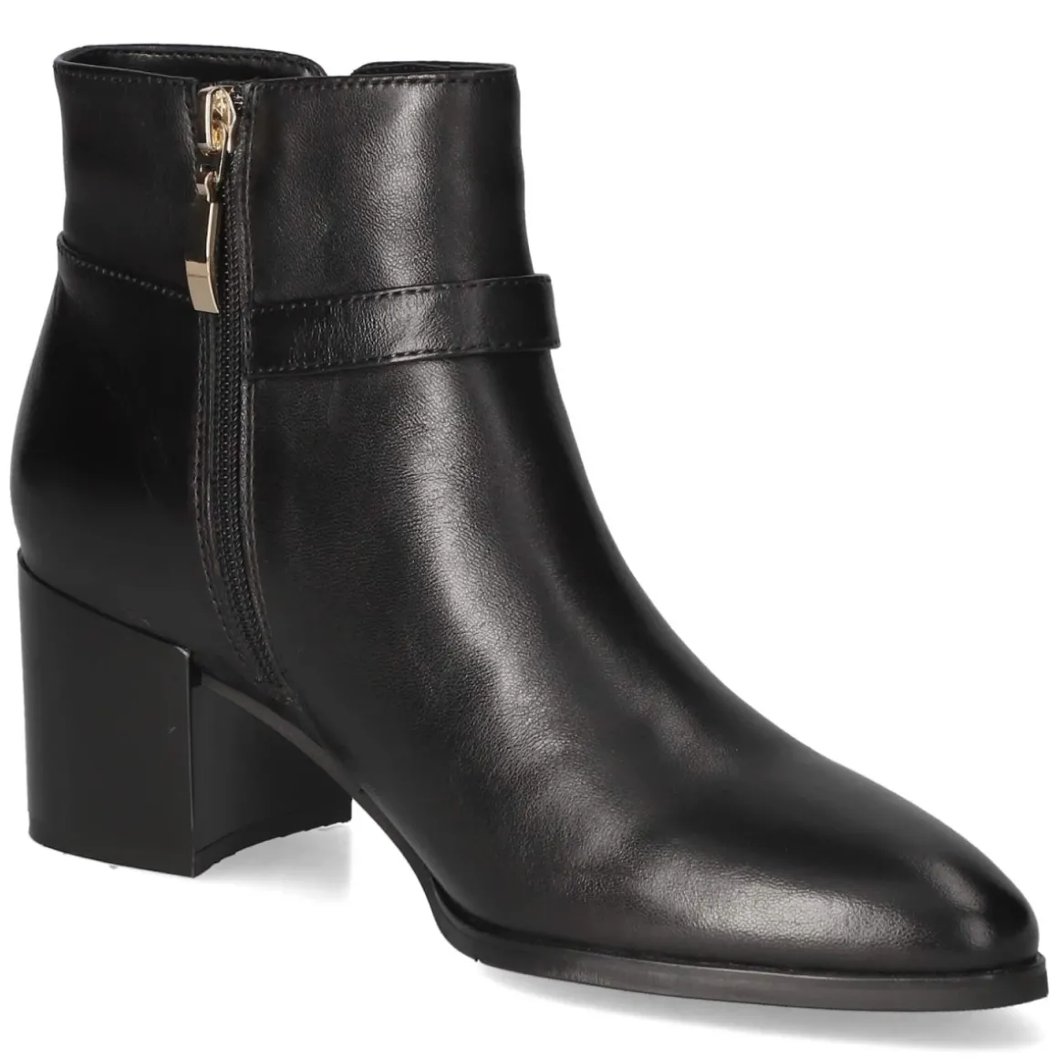 Kaerlek präsentiert eine klassische Stiefelette aus atmungsaktivem Echtleder, die mit zeitloser Eleganz und funktionalen Details überzeugt. Das schwarze Glattleder wirkt besonders hochwertig, während die runde Spitze und der 6 cm hohe Blockabsatz für eine feminine, dennoch standfeste Silhouette sorgen. Ein seitlicher Reißverschluss ermöglicht bequemes An- und Ausziehen. Die Decksohle aus Textil und Synthetik unterstützt ein angenehmes Fußklima, das leichte Futter bietet Wärme an kühlen Tagen. Für zusätzliche Stabilität sorgt eine verstärkte Ferse, die flexible, rutschhemmende Laufsohle gibt Sicherheit bei jedem Schritt. Als klassisches Modell mit Zierriemen und goldenem Schmuckdetail eröffnet es vielseitige Styling-Optionen und fällt in der Größe normal aus. Modetipp: In Kombination mit schmaler Denim, Oversize-Strick und goldfarbenem Schmuck entsteht ein mühelos urbaner Look.